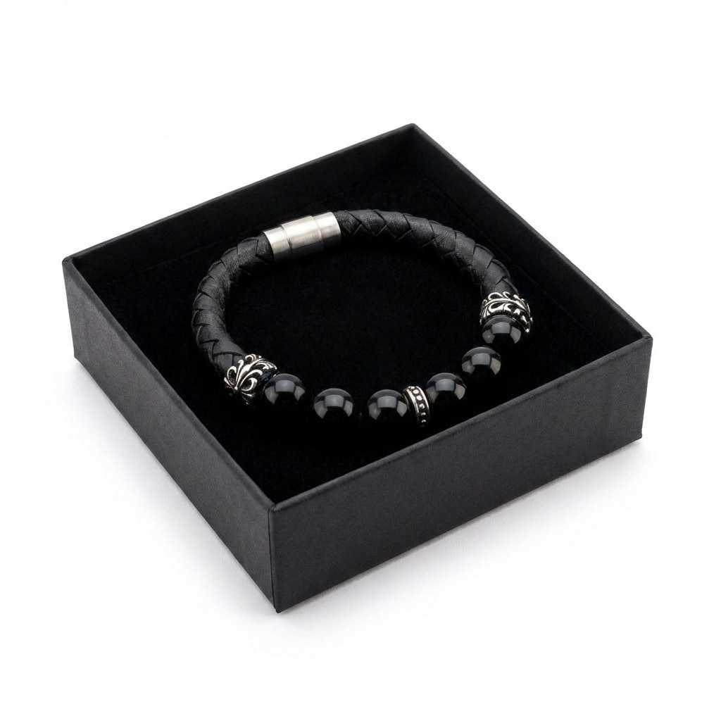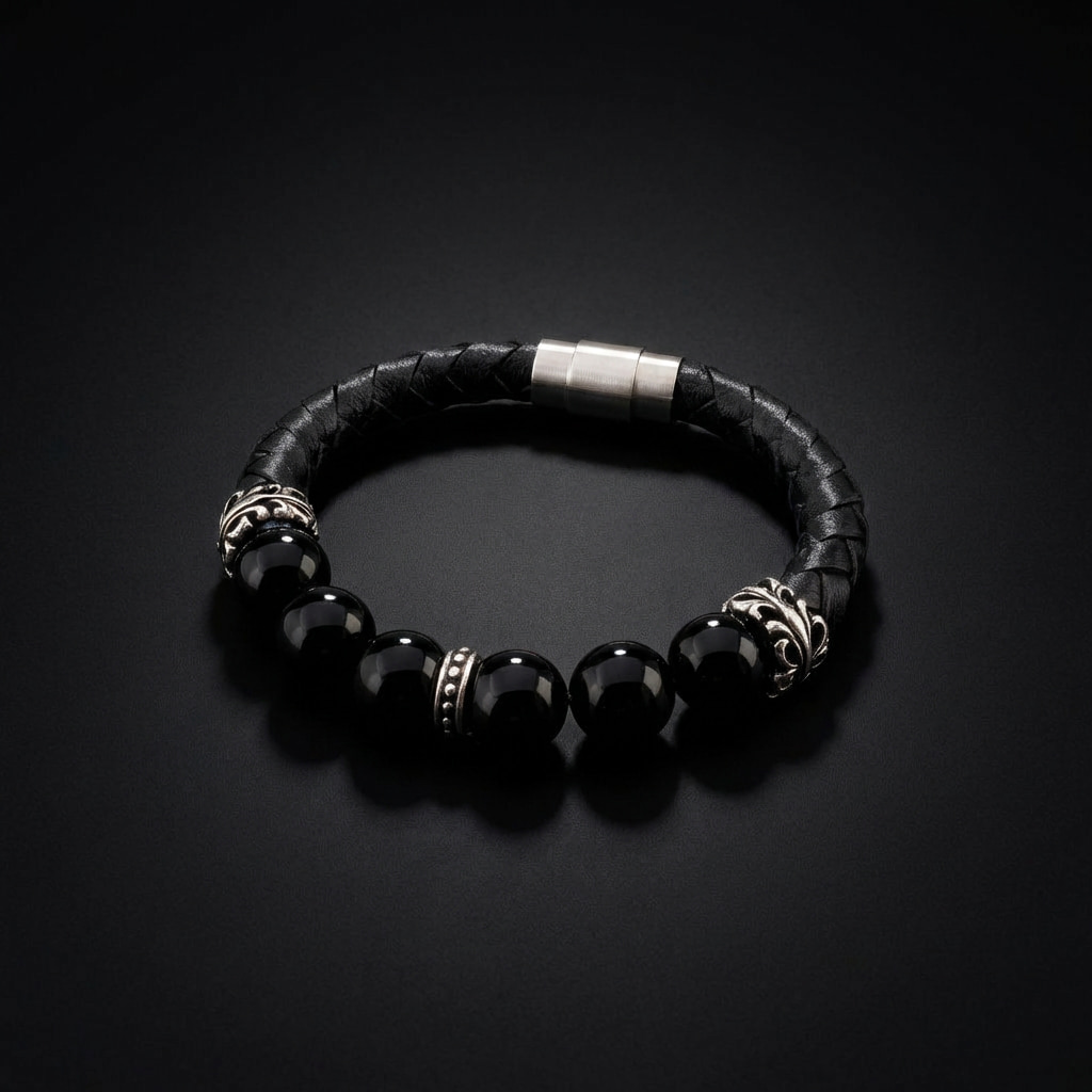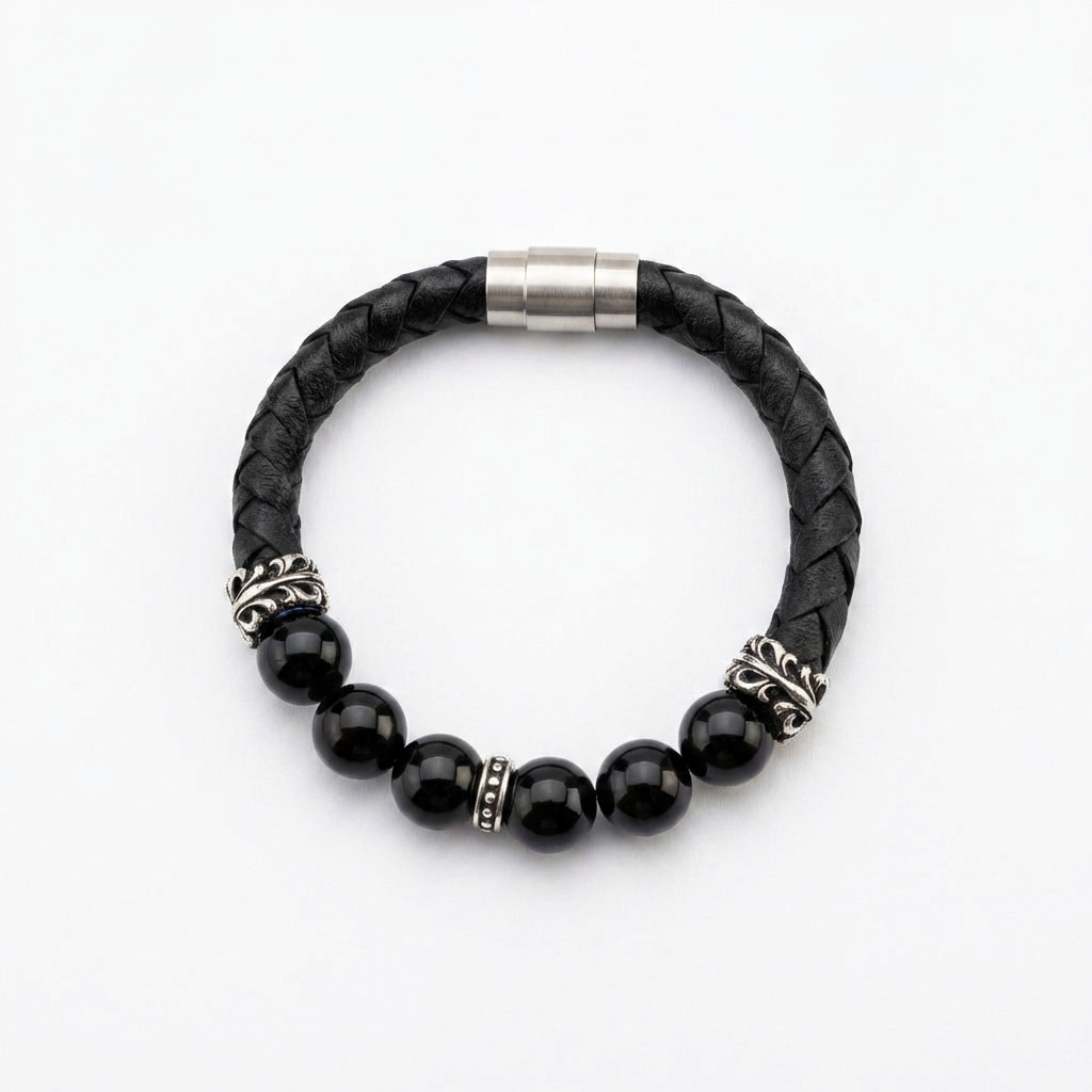 Meeste käevõru läikivate onyks kivide, hõbedate aktsendide ja põimitud nahaga.