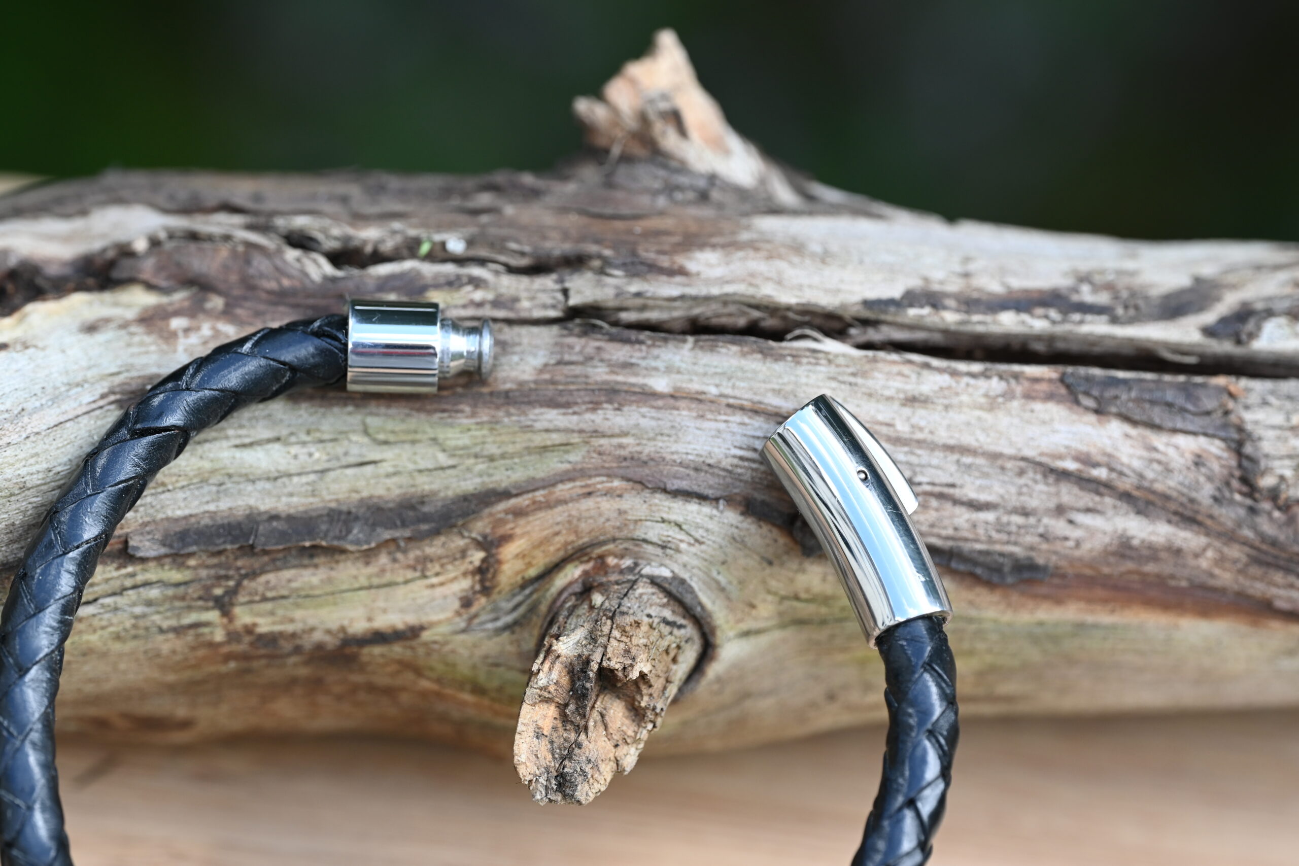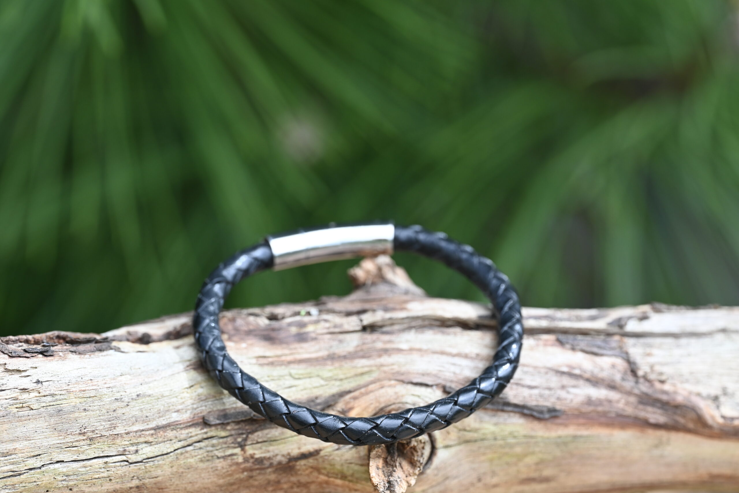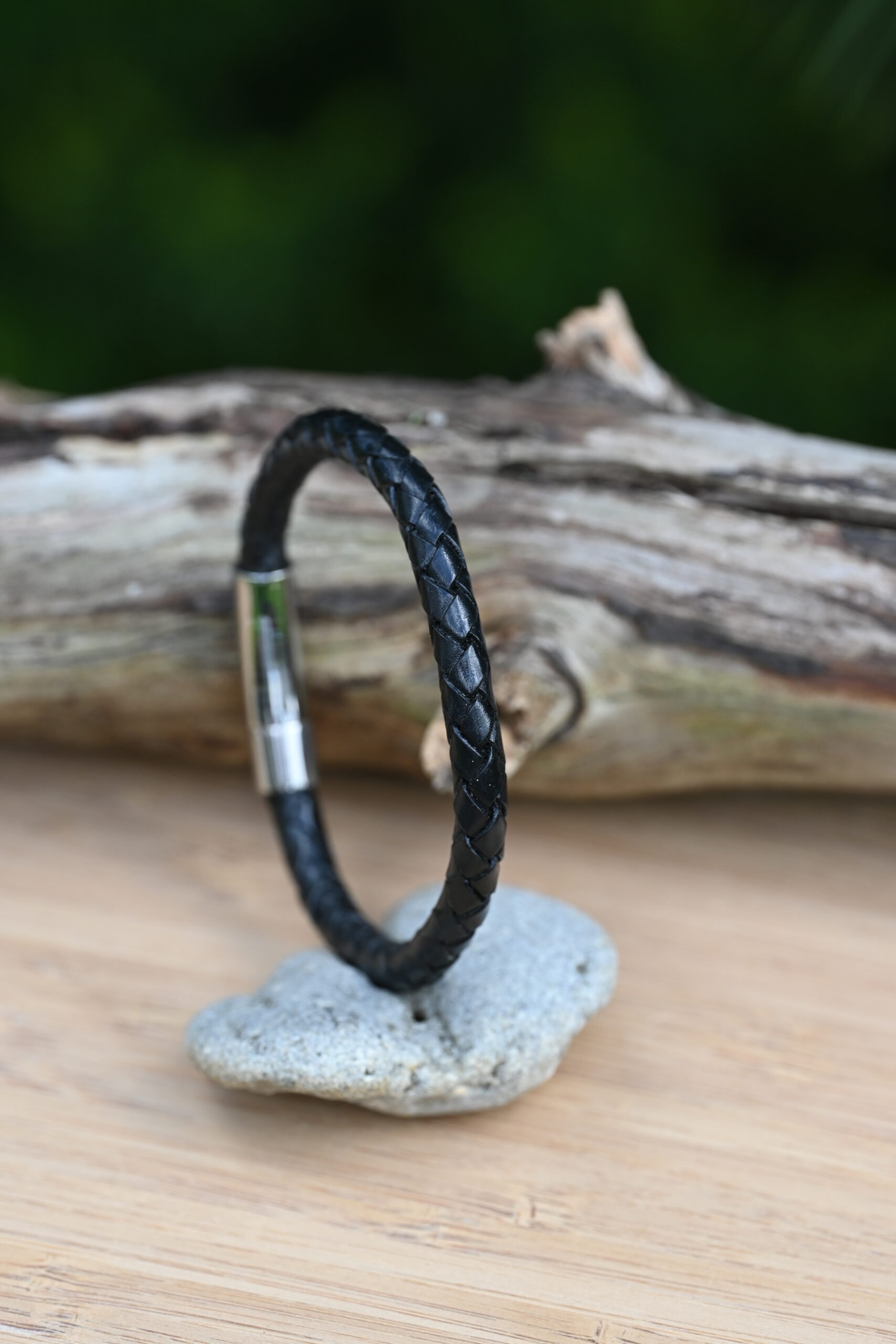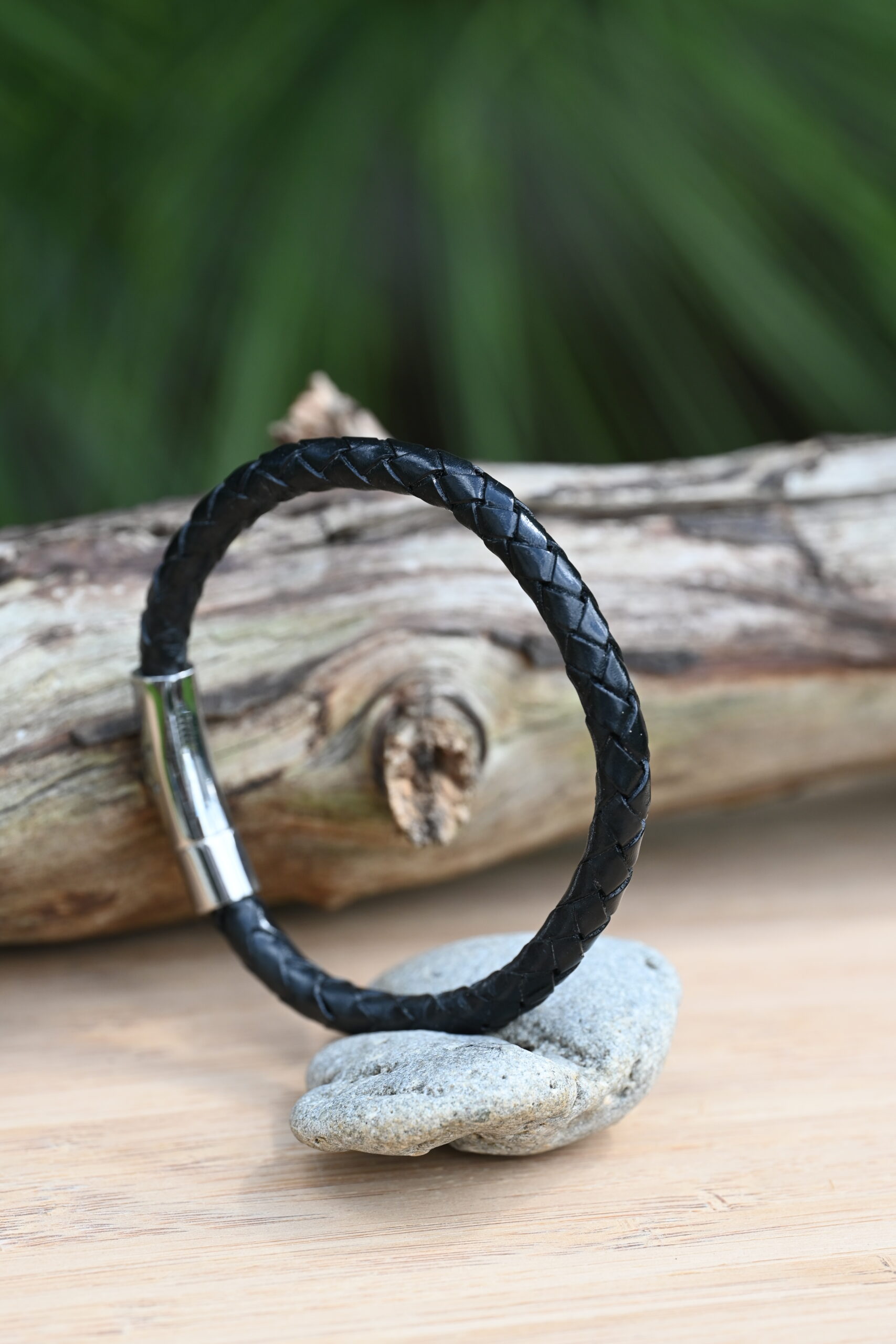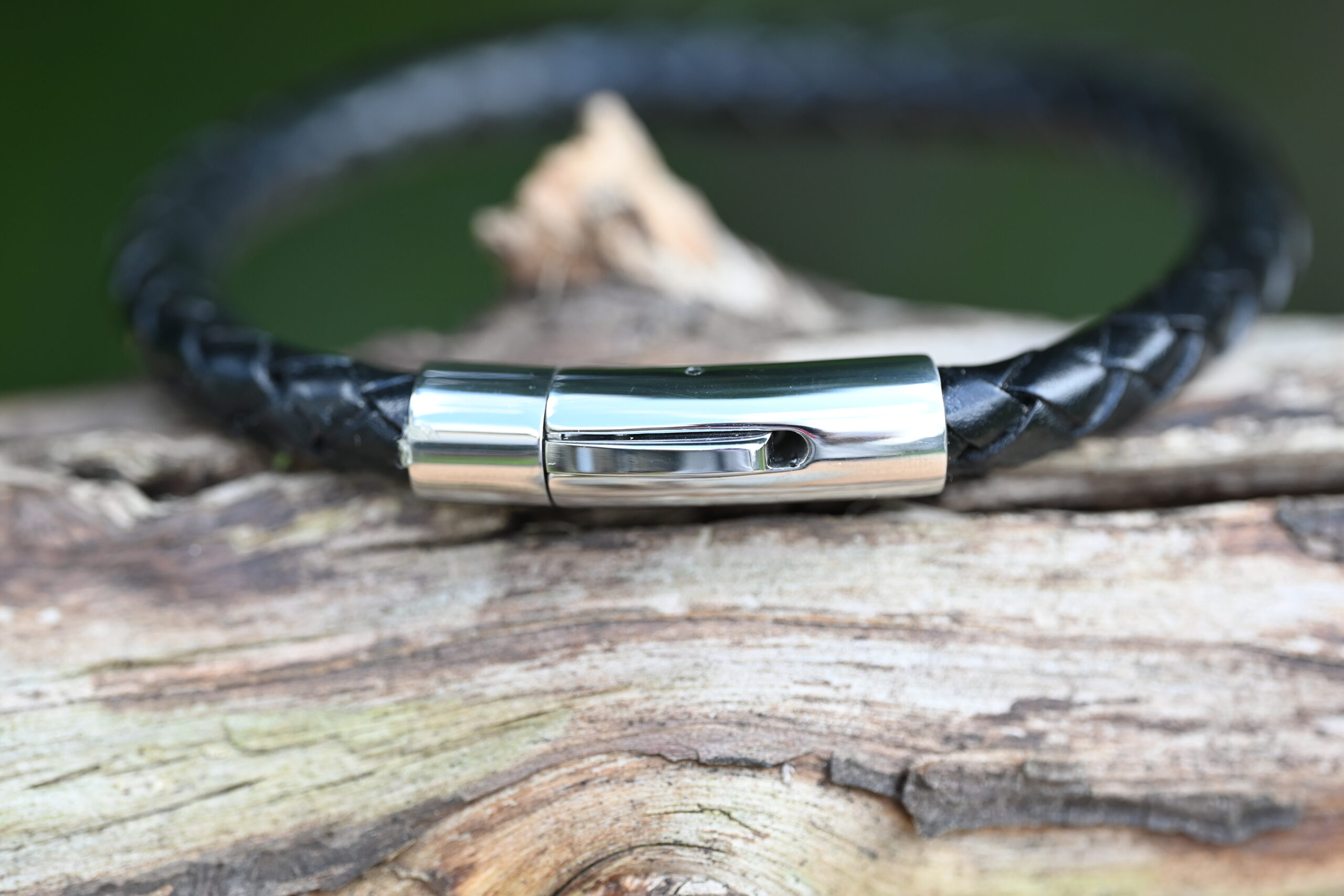 Meeste käevõru jõulise põimitud naha ja tugeva roostevabast terasest kinnitusega. Vastupidav, niiskuskindel ning sobib igapäevaseks kandmiseks.