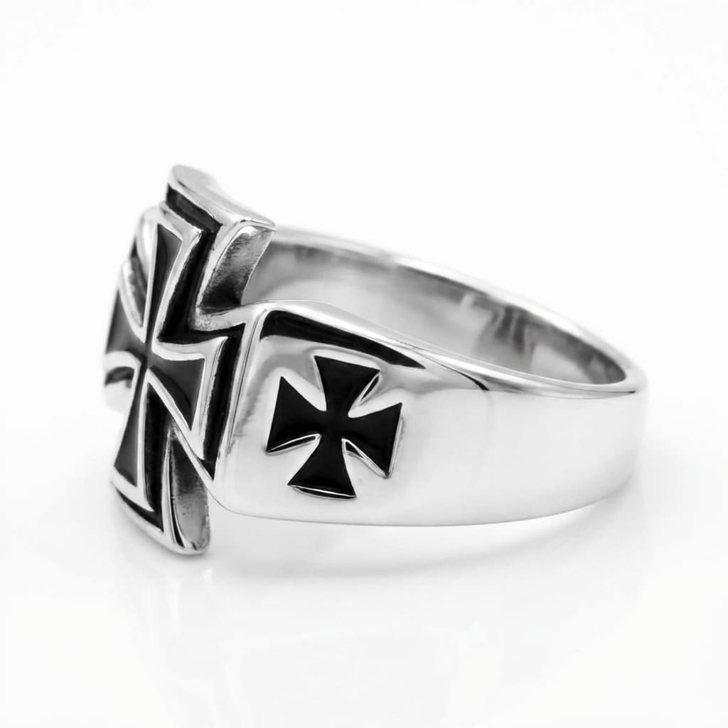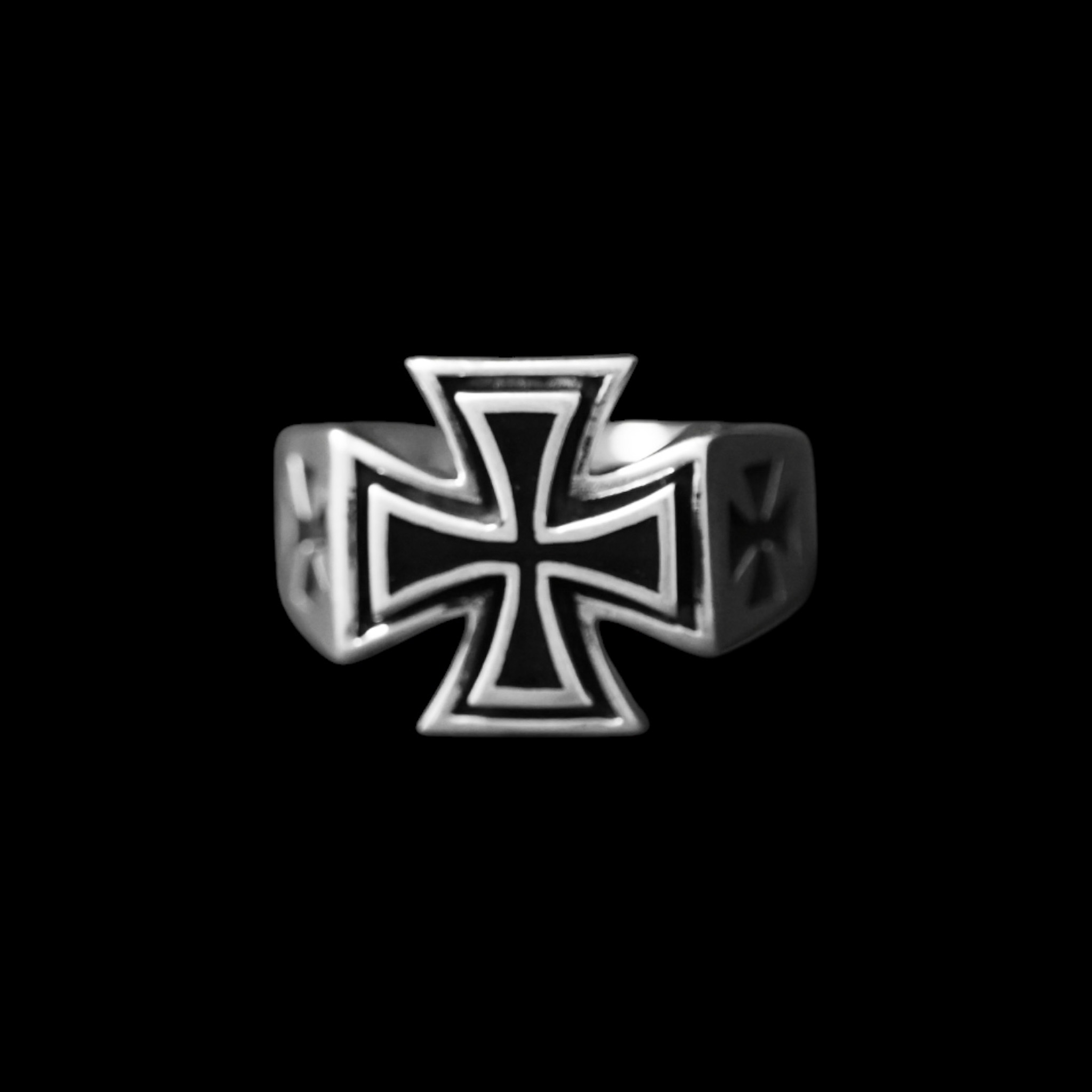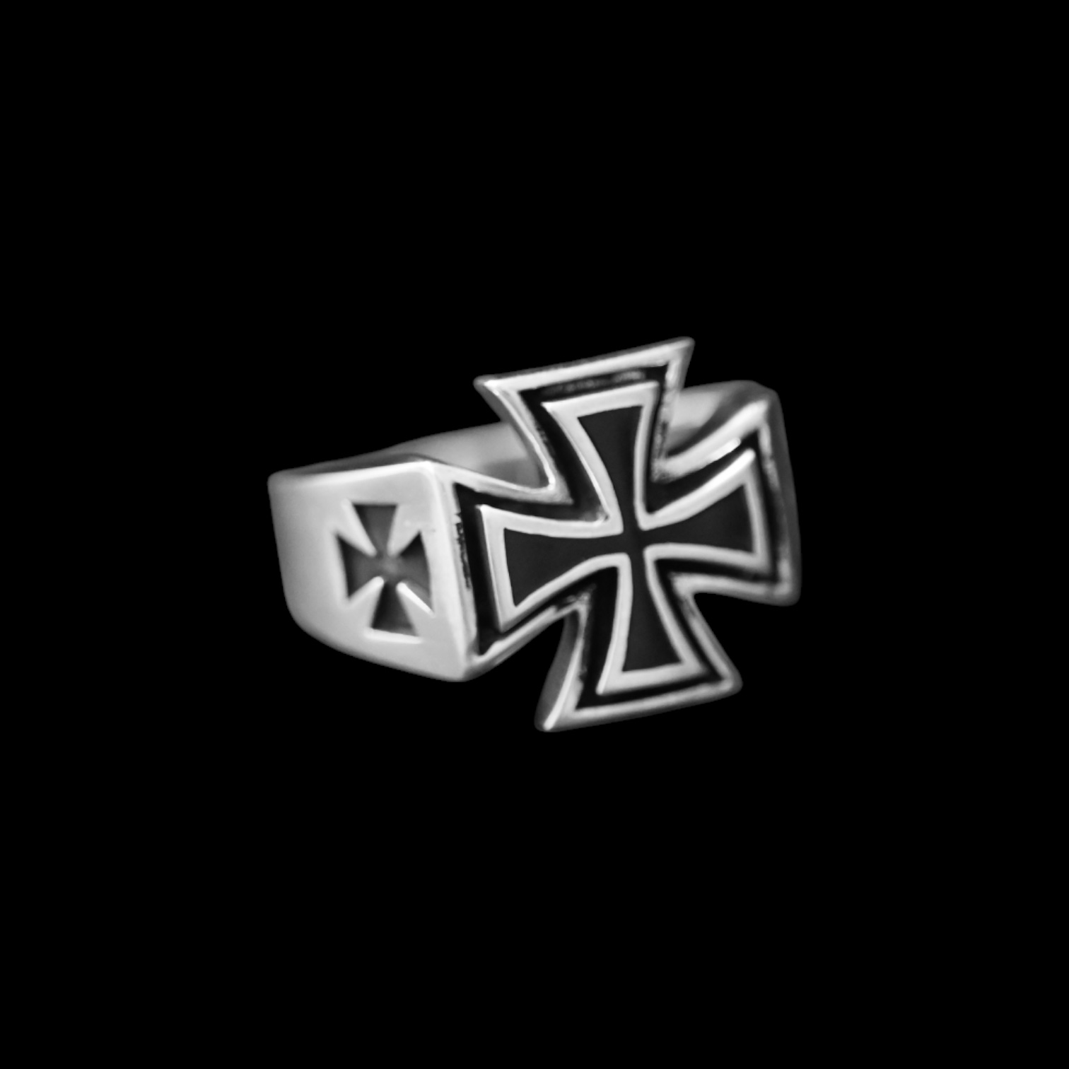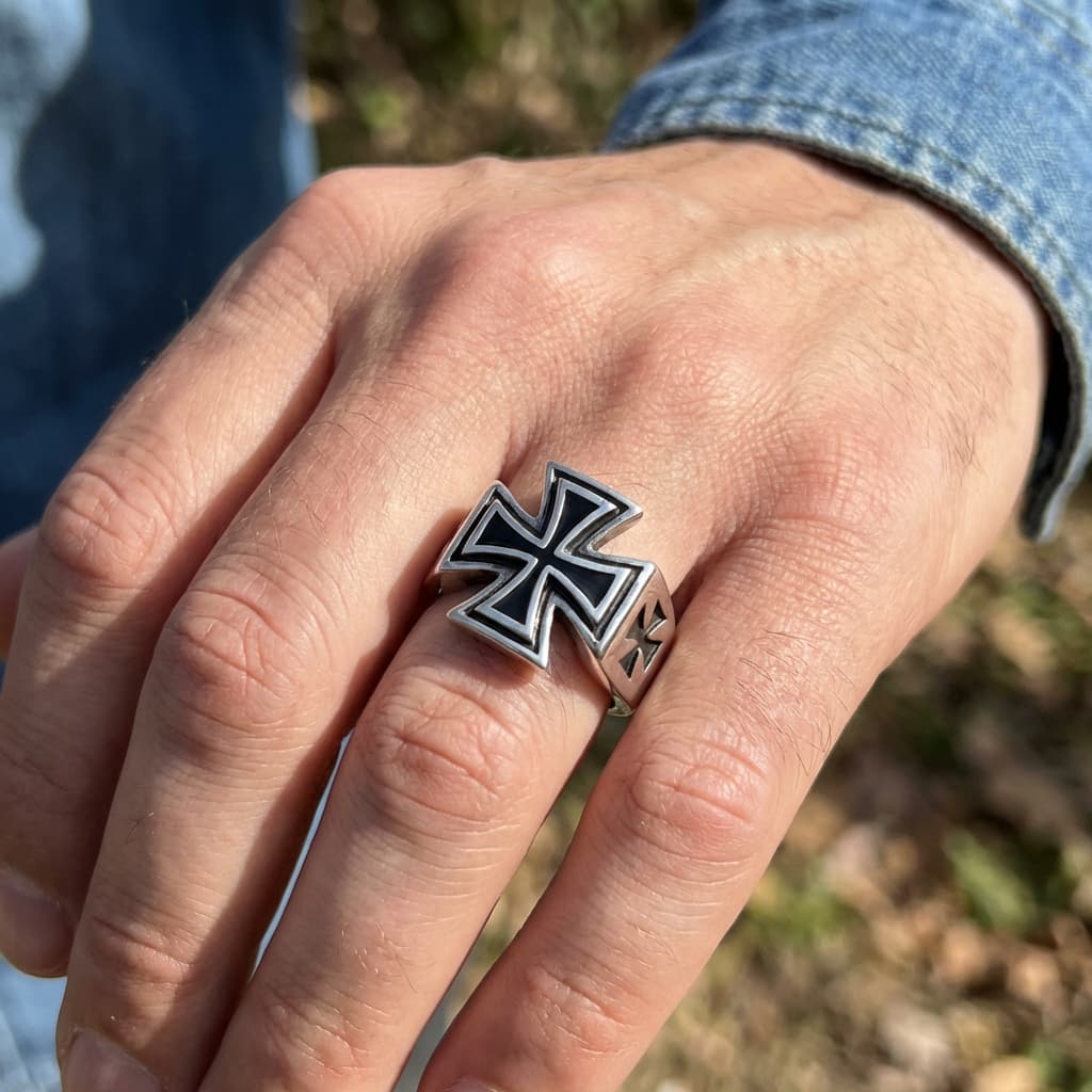 See meeste sõrmus on valmistatud täishõbedast 925 ja esitleb silmapaistvat raudristi disaini. Mustad emaili aktsendid rõhutavad julgeid jooni.
