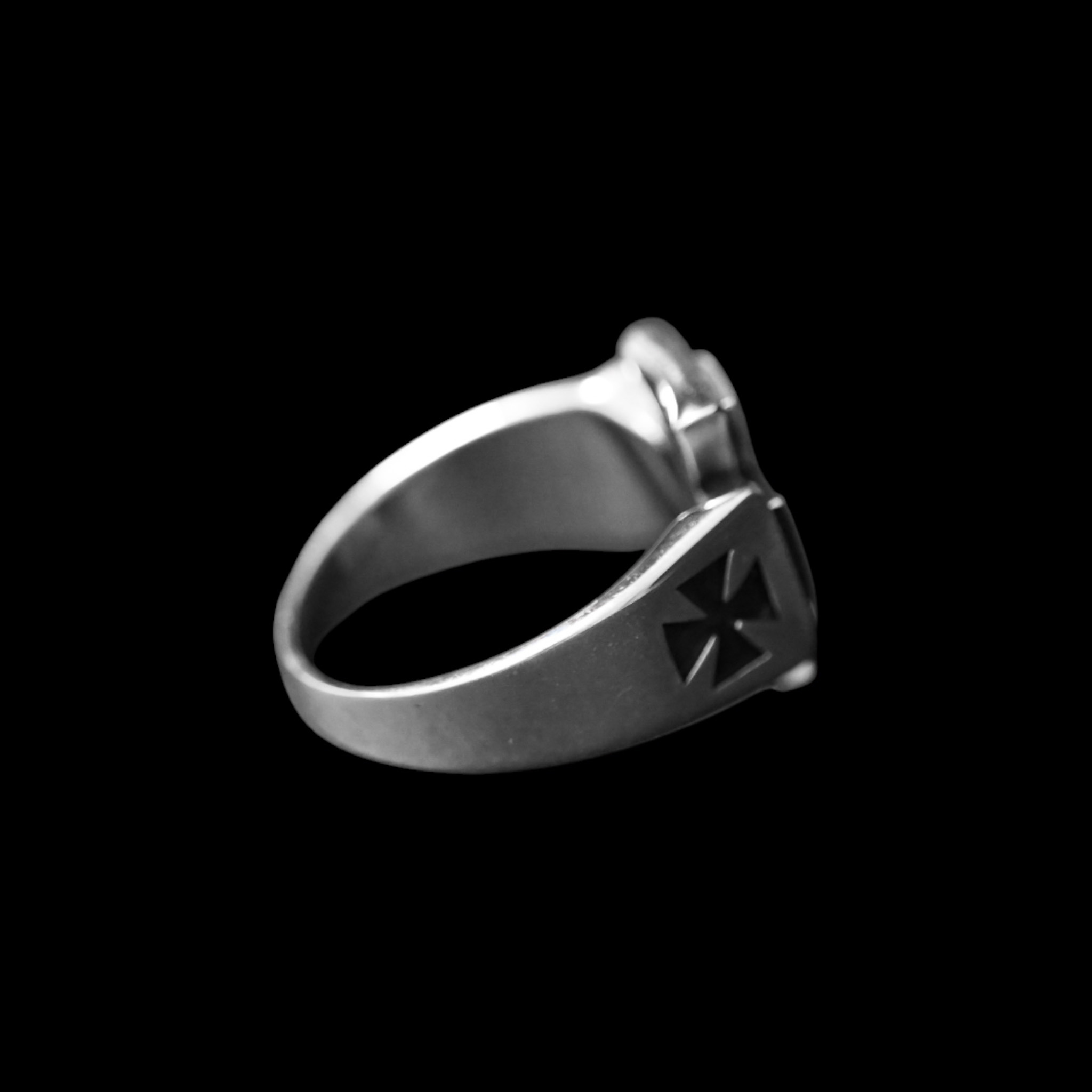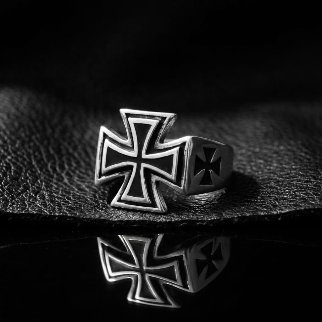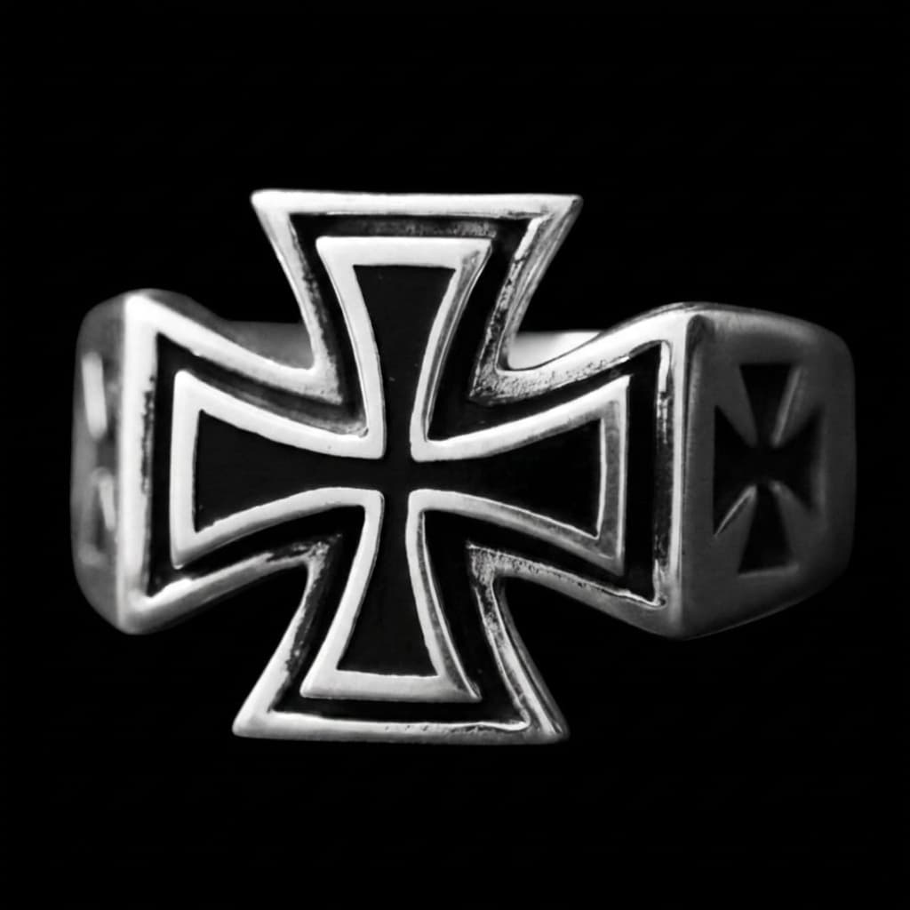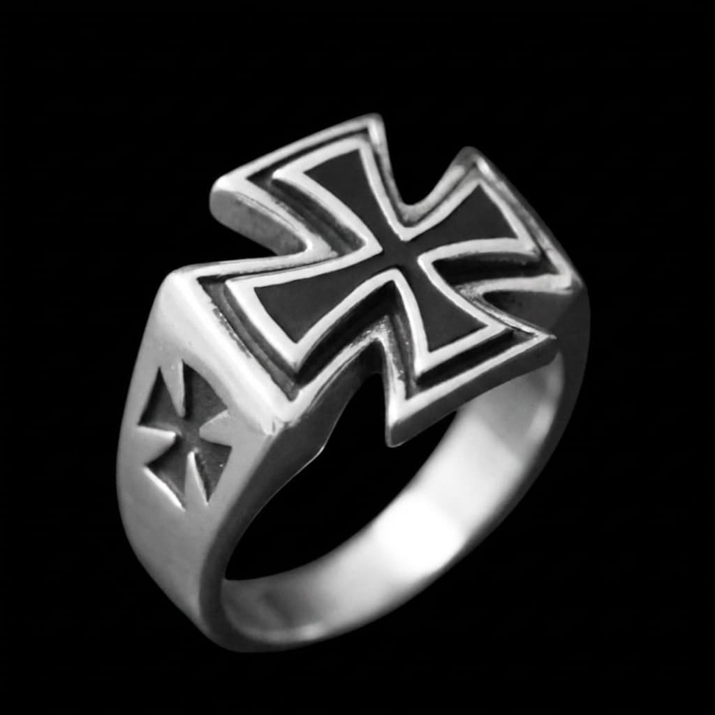 See meeste sõrmus on valmistatud täishõbedast 925 ja esitleb silmapaistvat raudristi disaini. Mustad emaili aktsendid rõhutavad julgeid jooni.