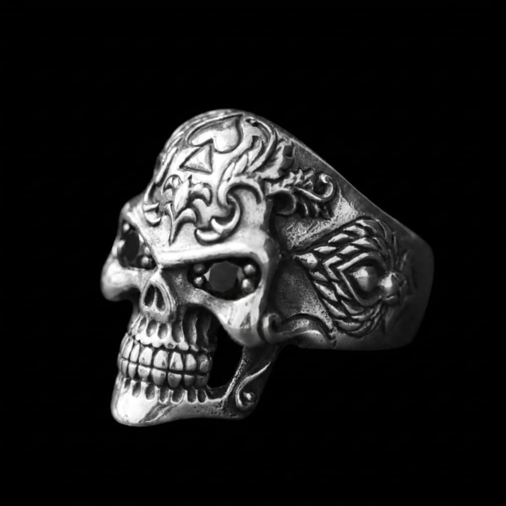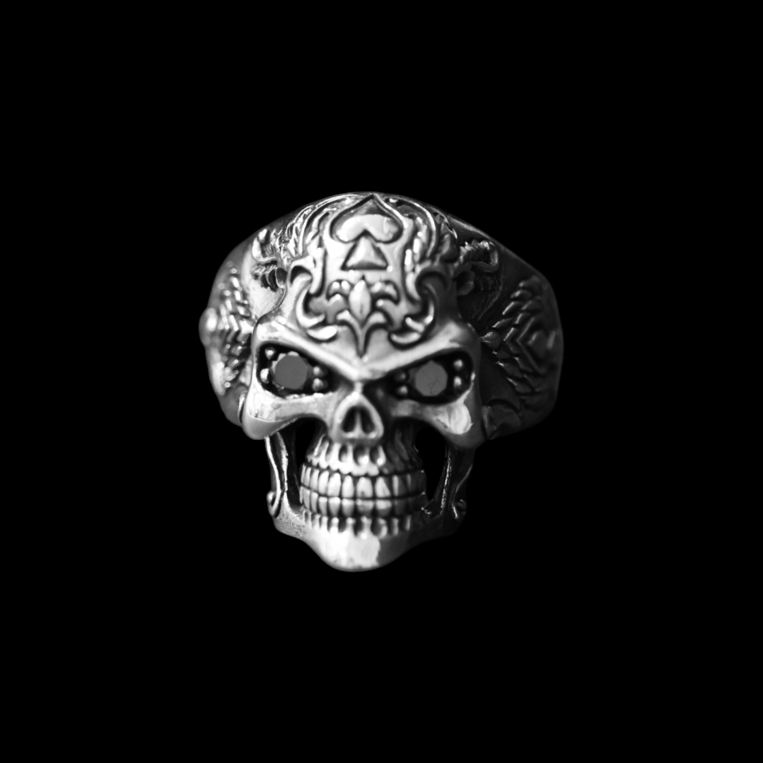 Valmistatud täishõbedast 925, see meeste sõrmus esitleb silmapaistvat pealuu disaini keerukate graveeringutega. Labida sümbol kaunistab otsmikku.