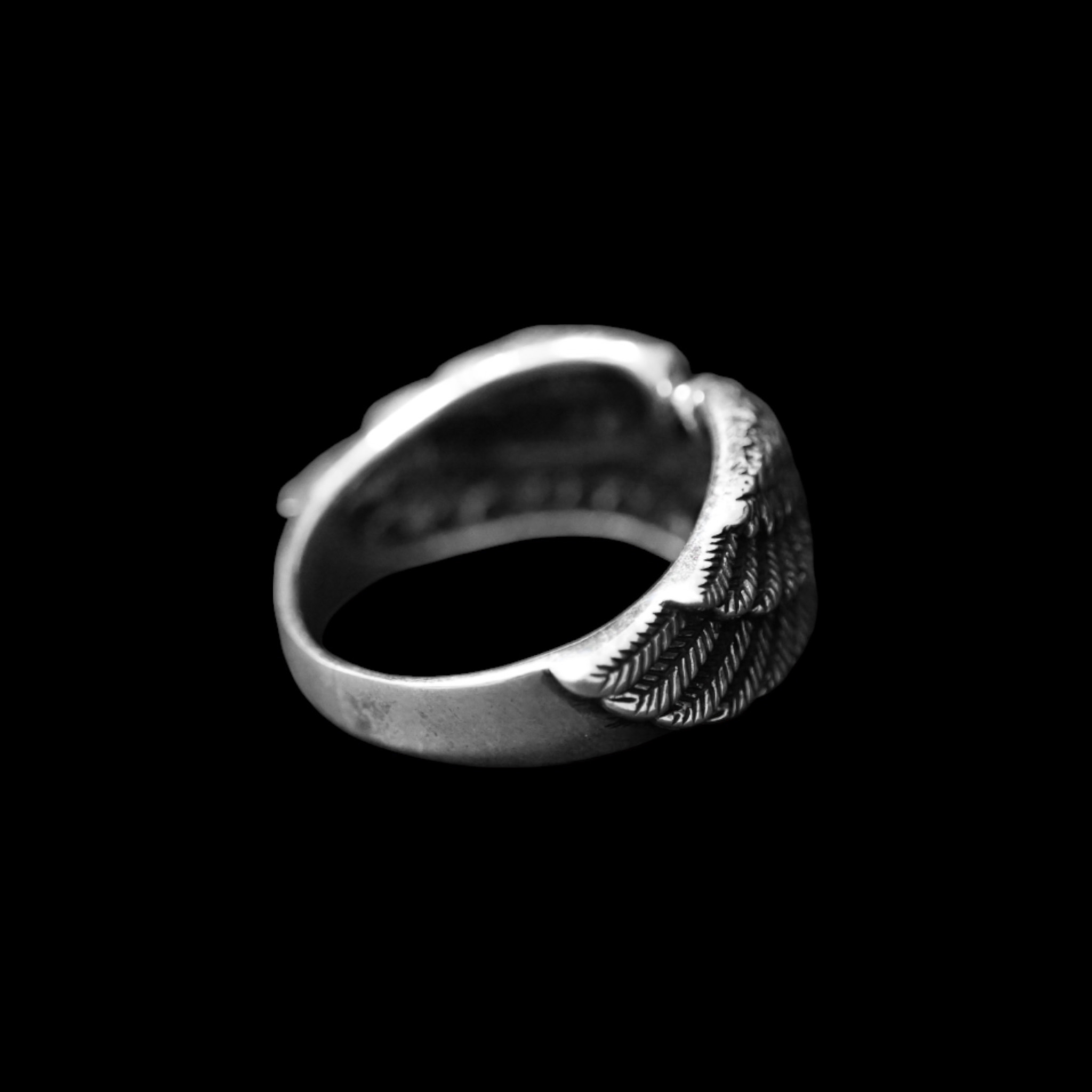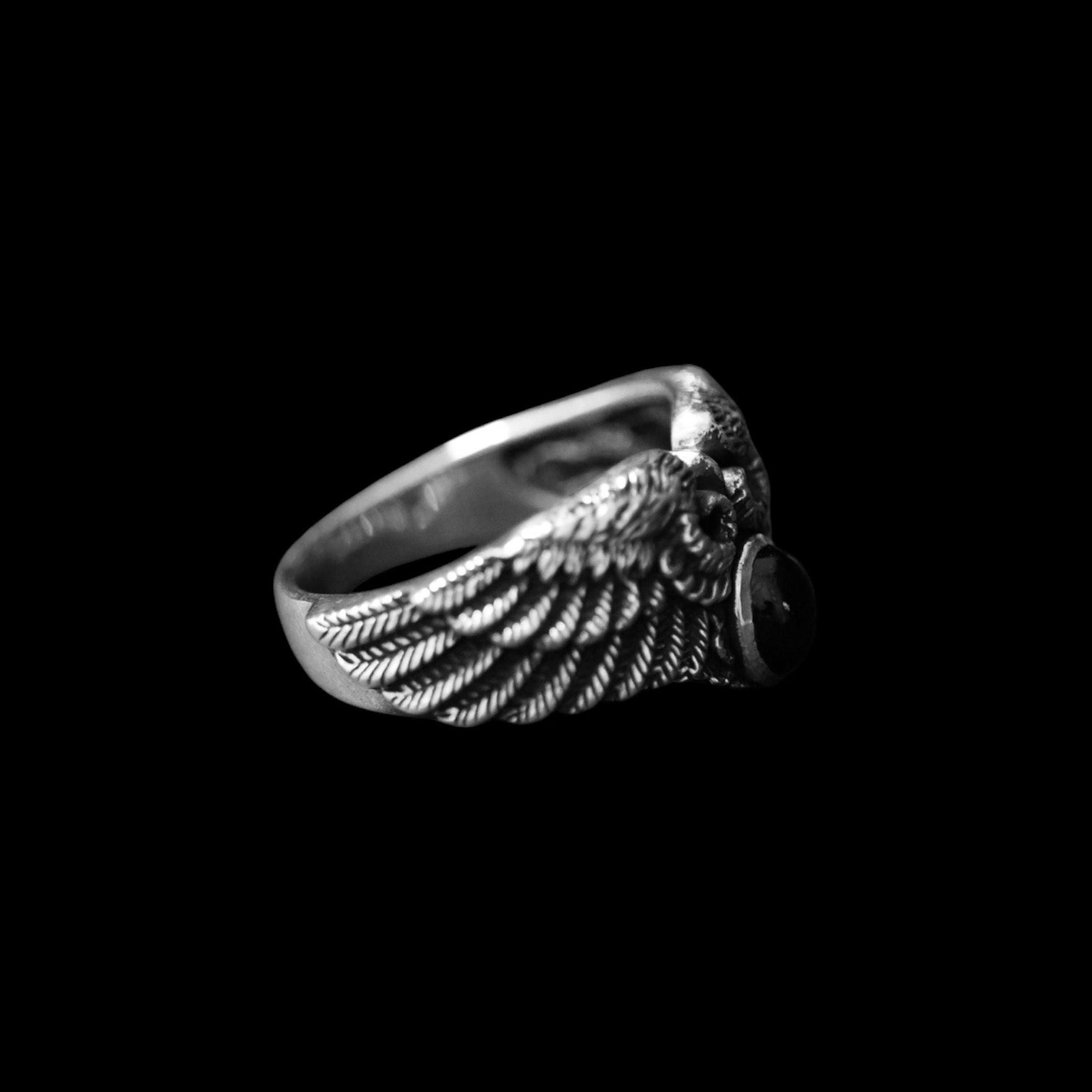 Valmistatud täishõbedast 925, see meeste sõrmus esitleb lihvitud musta onüksi kivi, mida raamivad keerukalt detailsed tiivad.