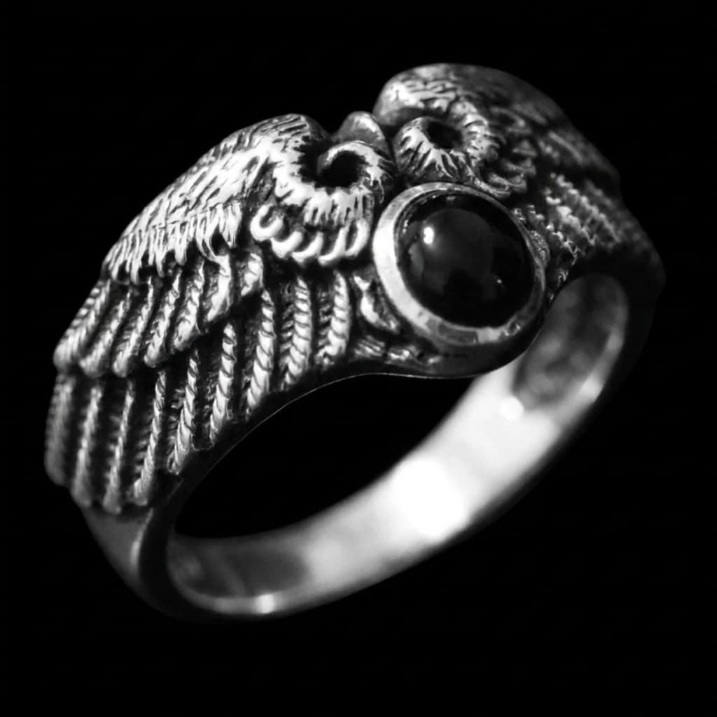 Täishõbedast 925 meeste sõrmus detailsete tiibade ja musta onüksi keskkiviga. Oksüdeeritud viimistlus.