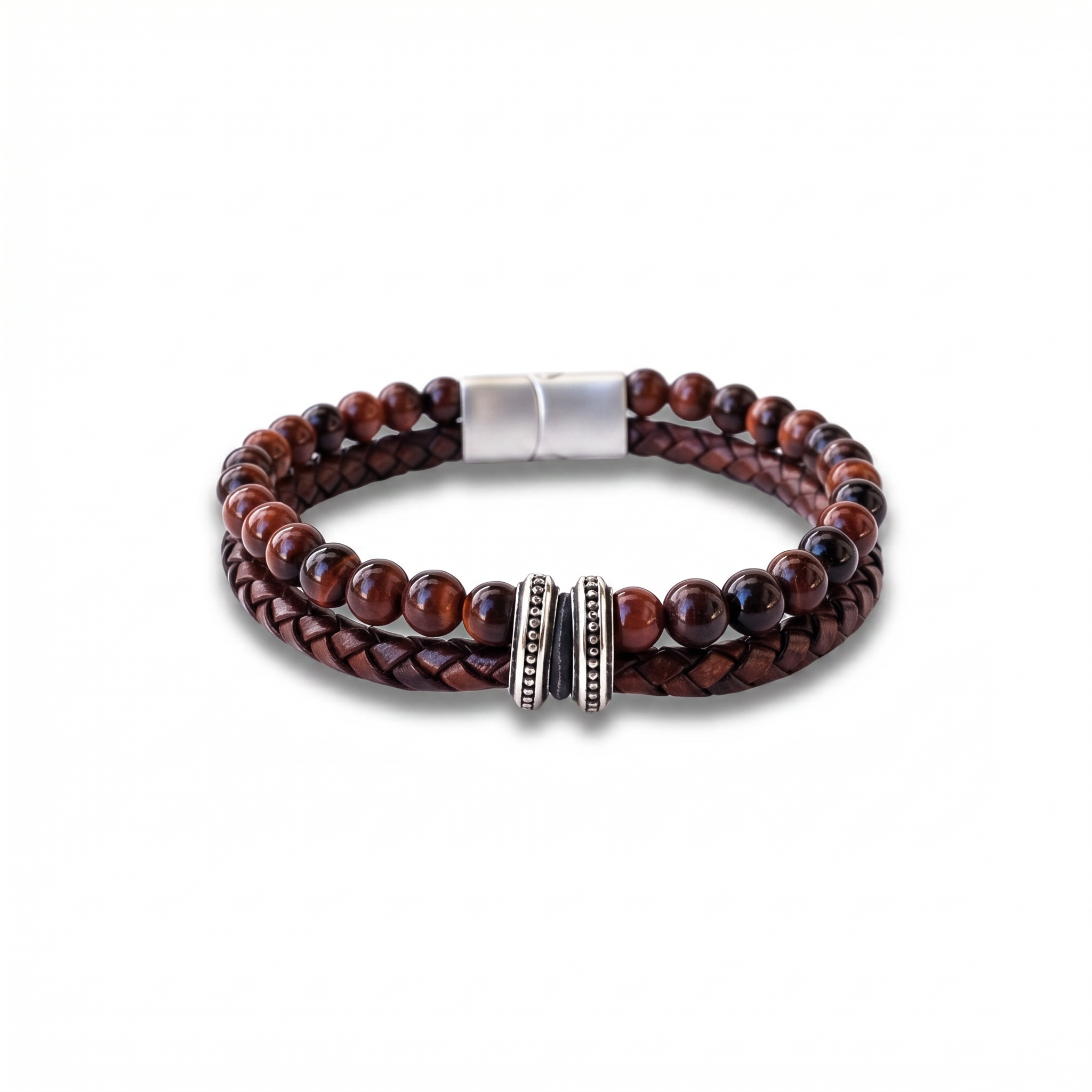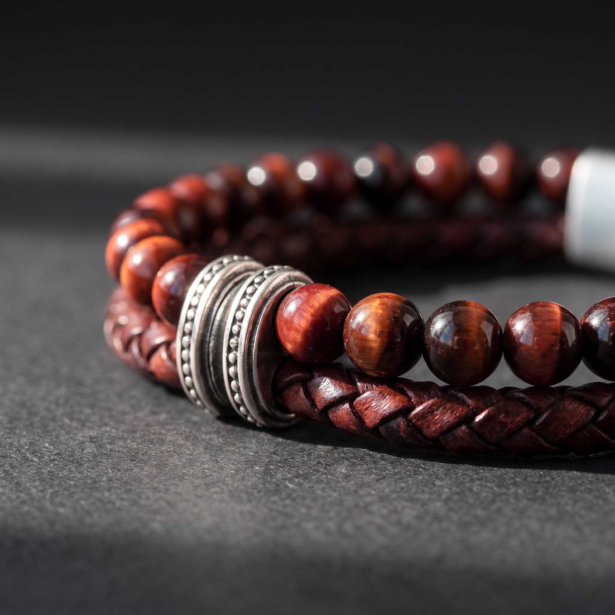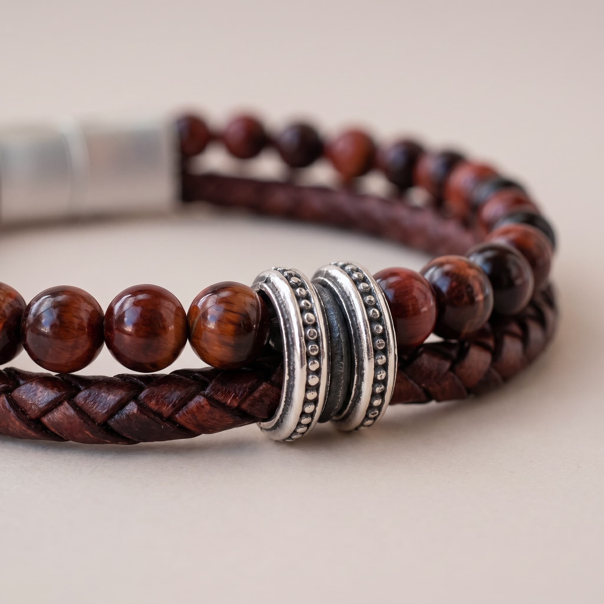Käevõru koosneb kahest kihist: punase tiigrisilmakivi helmestring ja käsitsi punitud ehtne nahkpael. Suletakse roostevabast terasest klapplukuga. Materjal on roostekindel, niiskuskindel ja hüpoallergeenne — sobib igapäevaseks kandmiseks ka aktiivse eluviisi juures.
