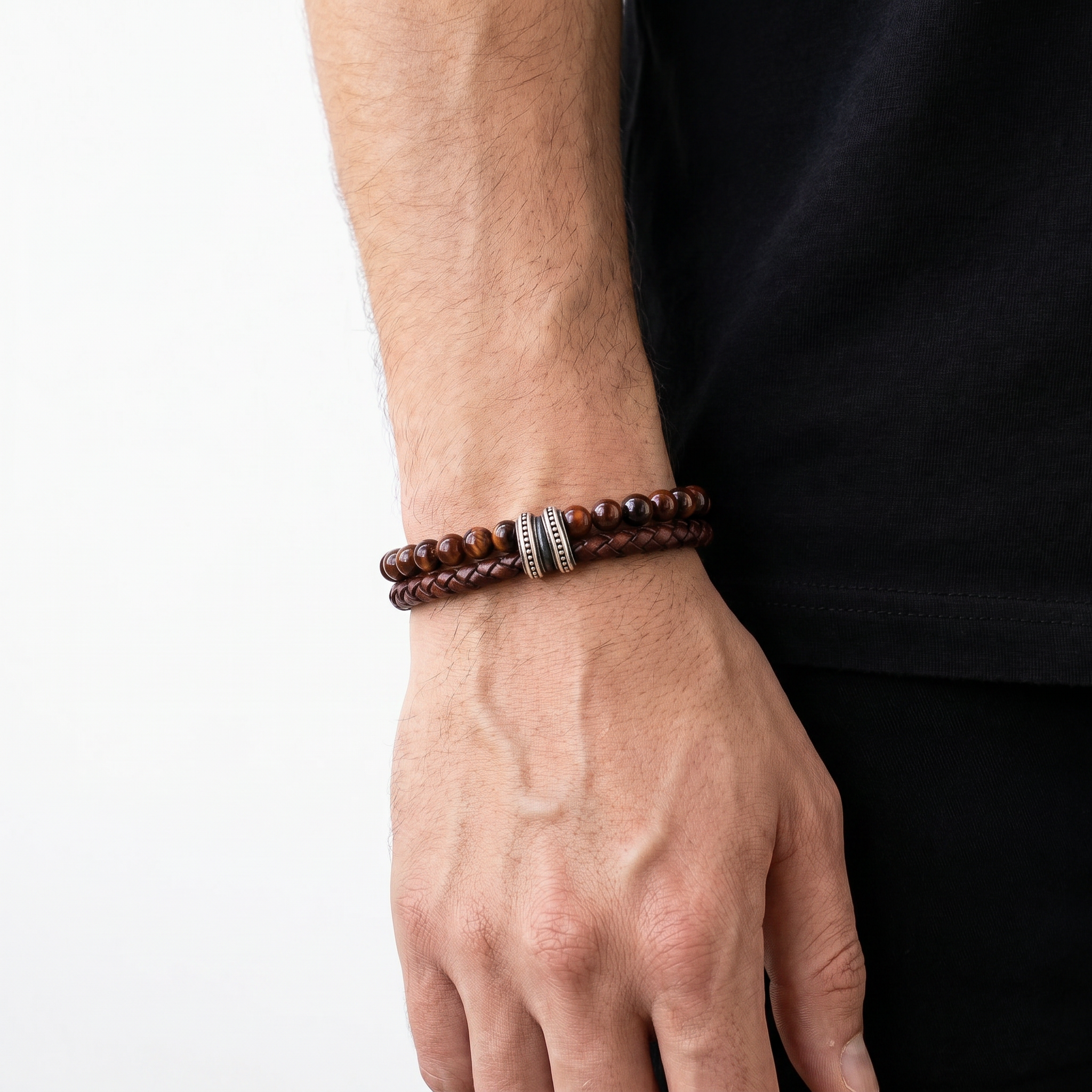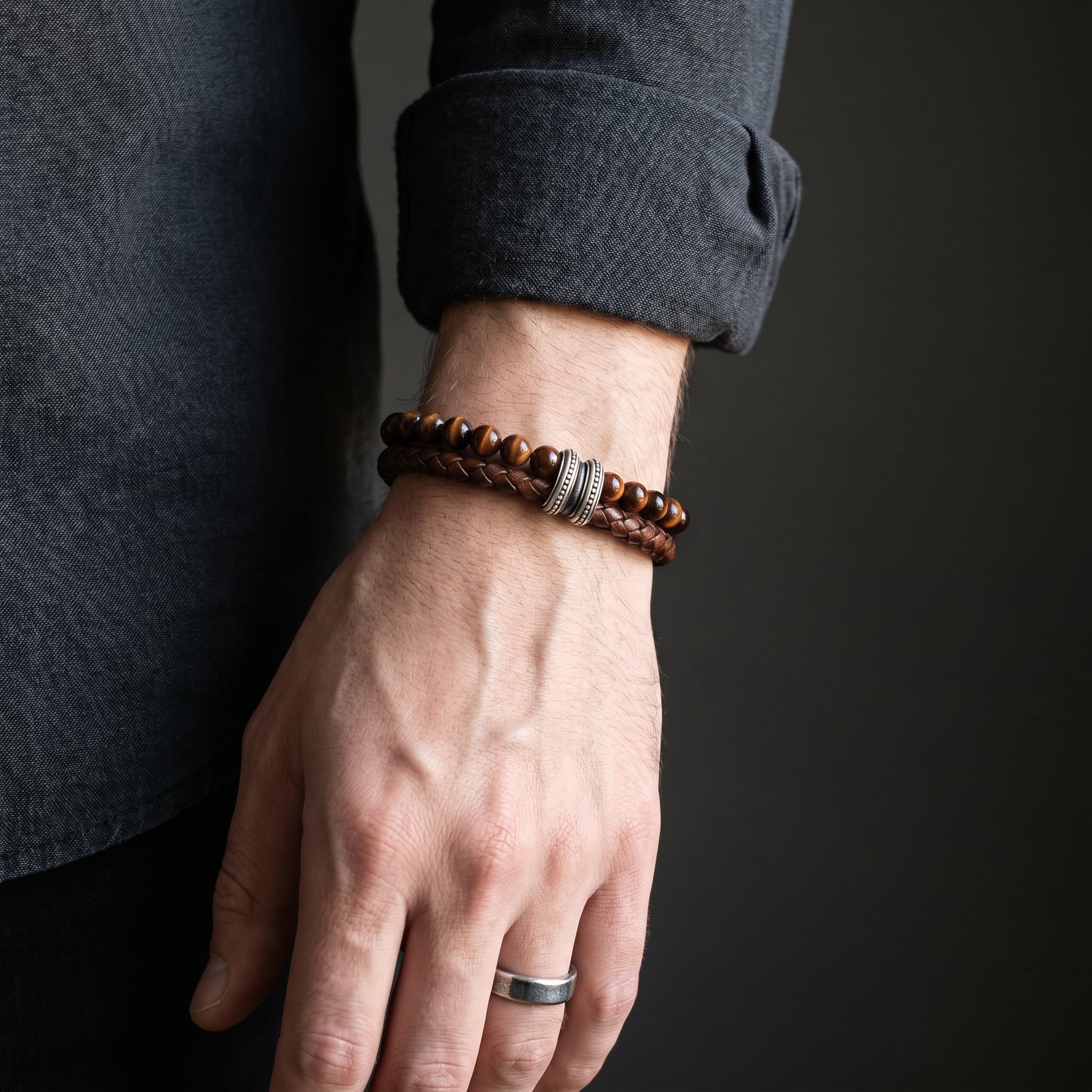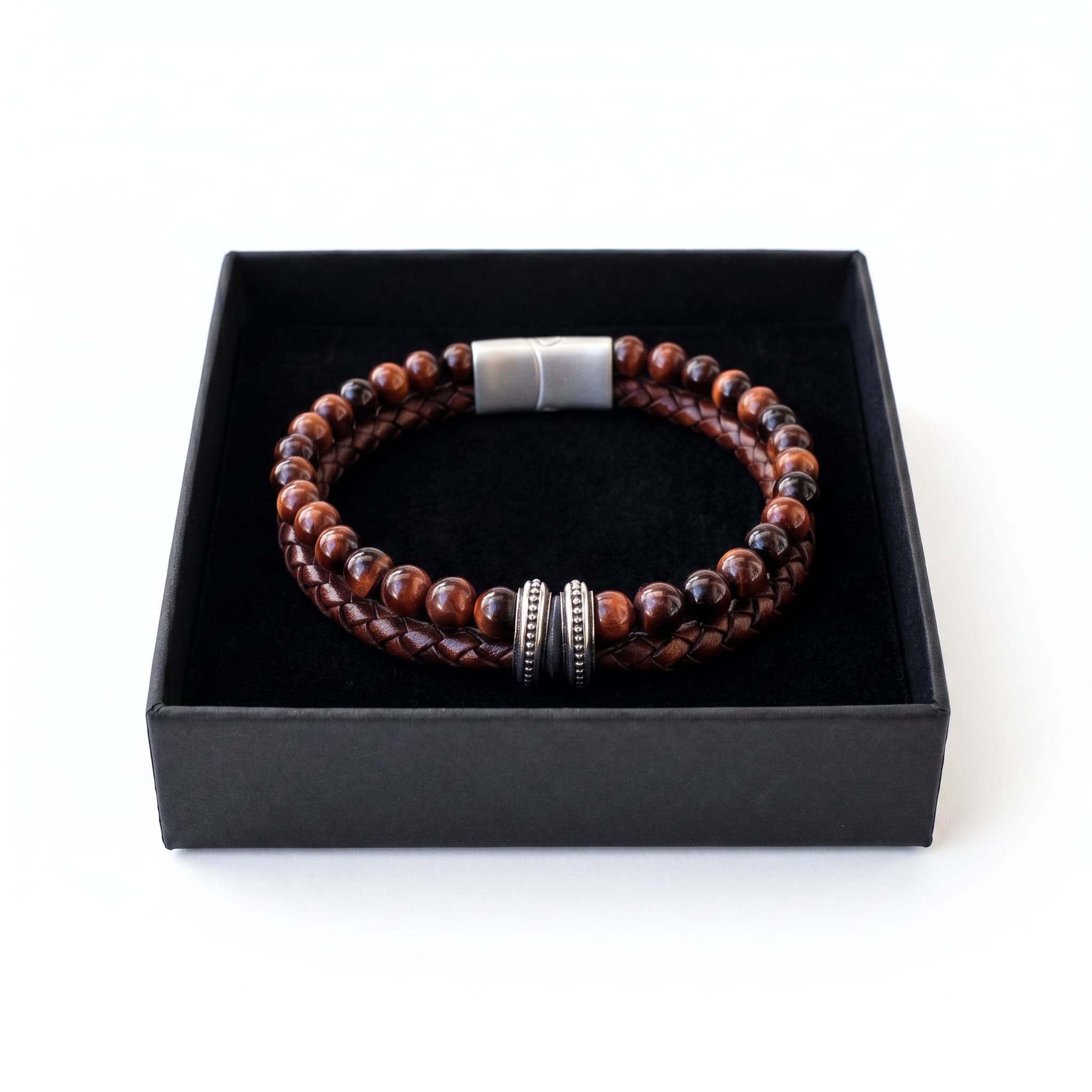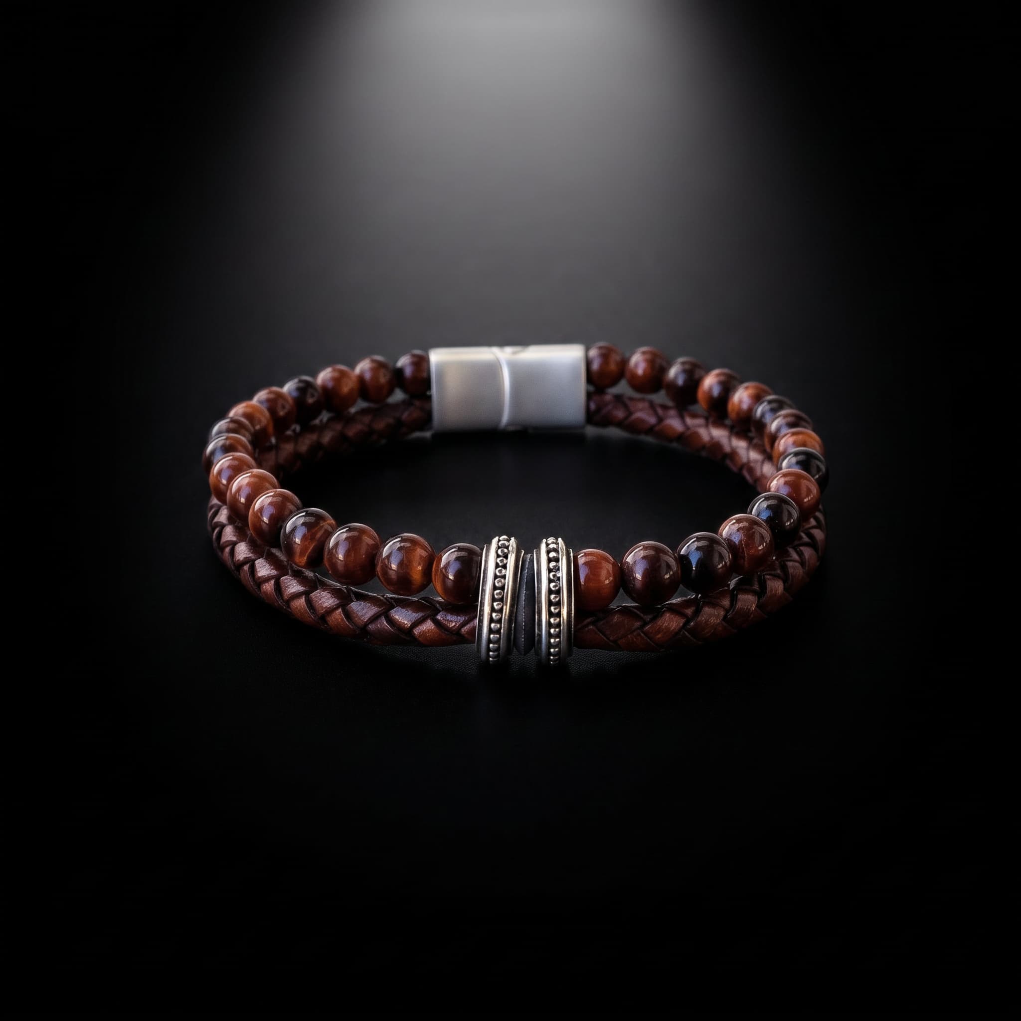 Käevõru koosneb kahest kihist: punase tiigrisilmakivi helmestring ja käsitsi punitud ehtne nahkpael. Suletakse roostevabast terasest klapplukuga. Materjal on roostekindel, niiskuskindel ja hüpoallergeenne — sobib igapäevaseks kandmiseks ka aktiivse eluviisi juures.
