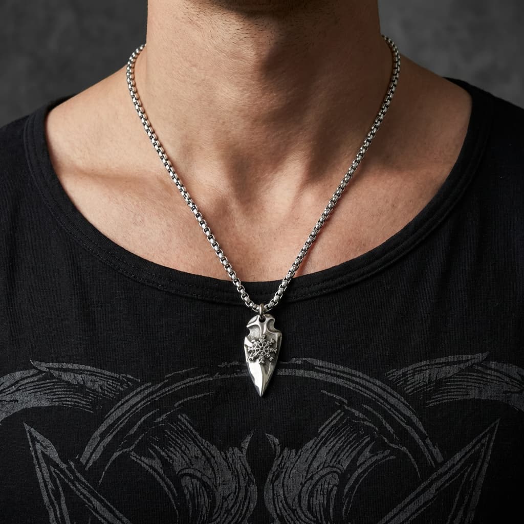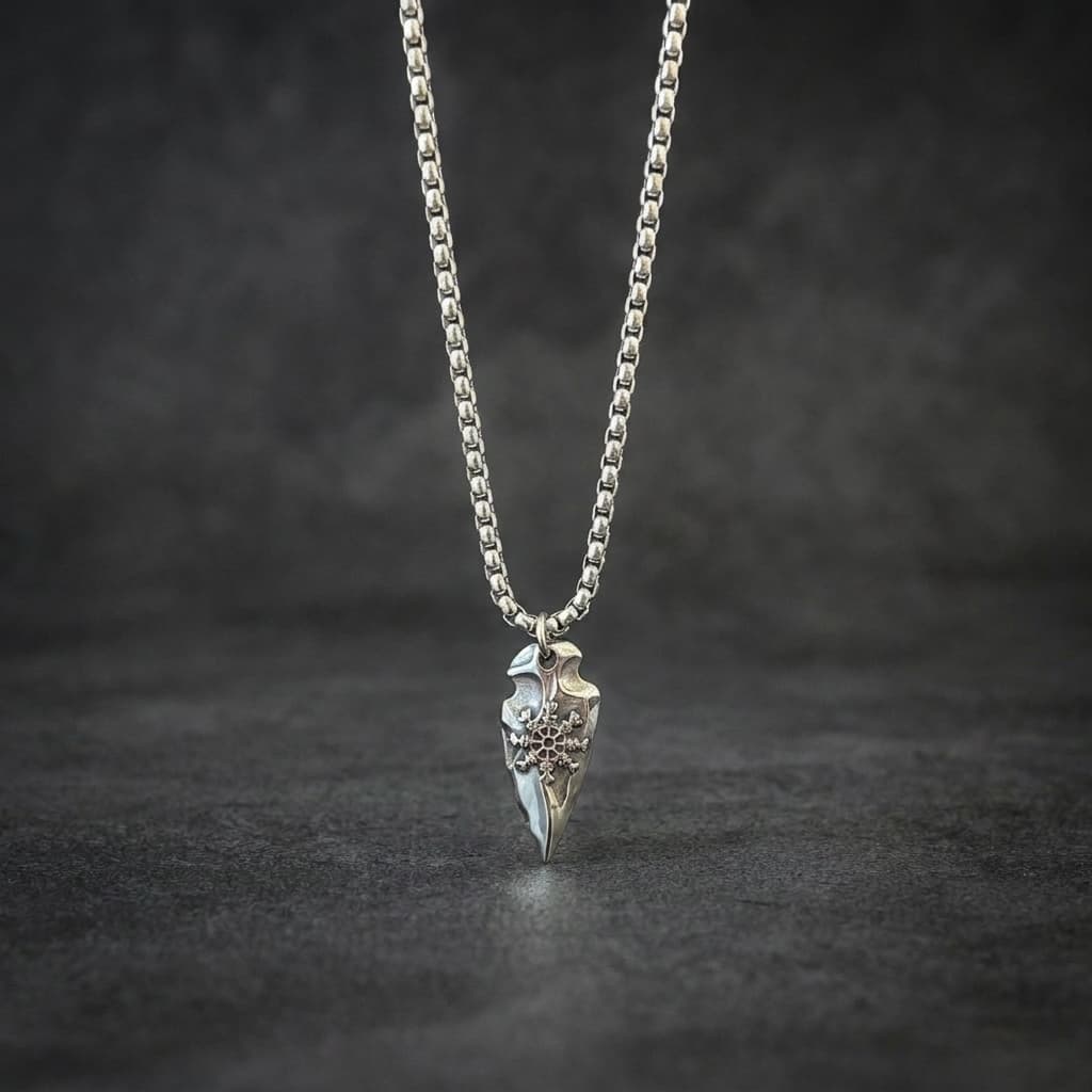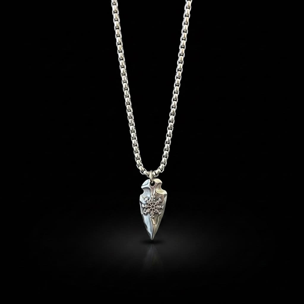 See meeste kaelakee on valmistatud vastupidavast roostevabast terasest. Ripats on nooleotsaku kujuline koos keeruka graveeringuga. See on roostekindel, niiskuskindel, higikindel ja hüpoallergeenne. Vastupidav igapäevaseks kandmiseks, ei tuhmu ega jäta nahale rohelist värvi. Mugav kanda ja sobib ka tundlikule nahale.