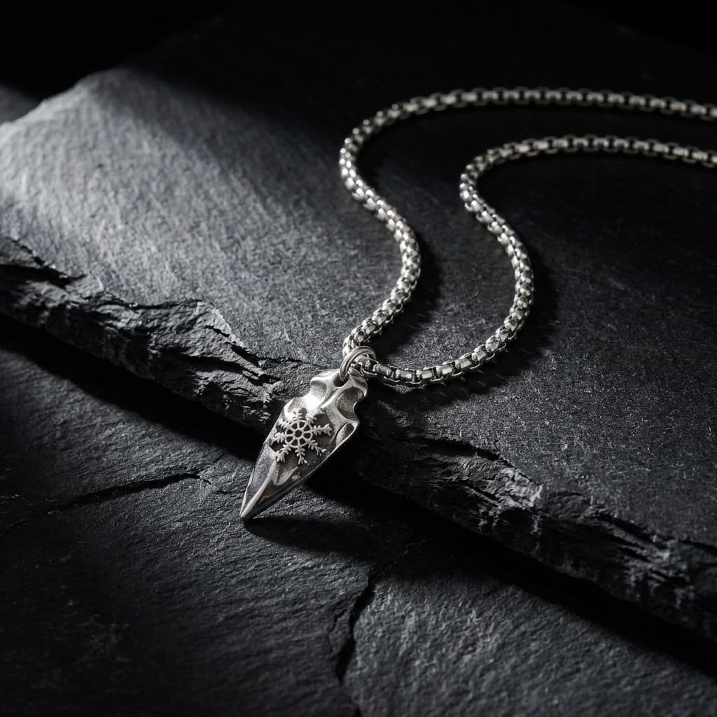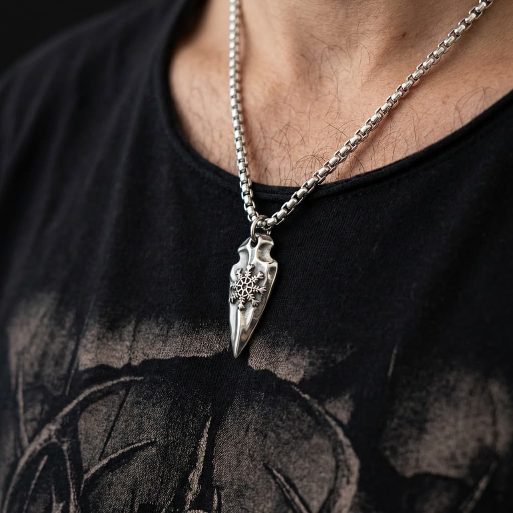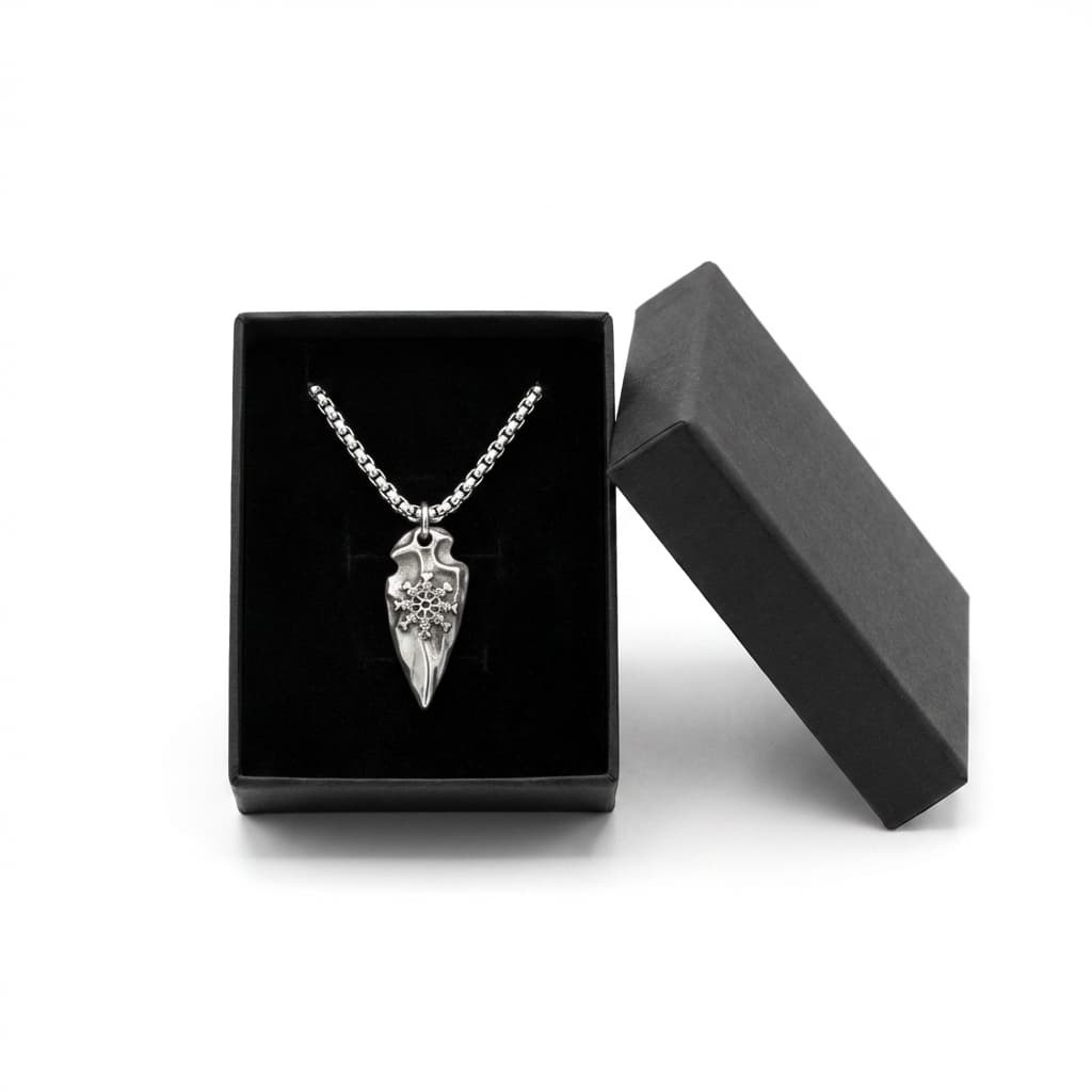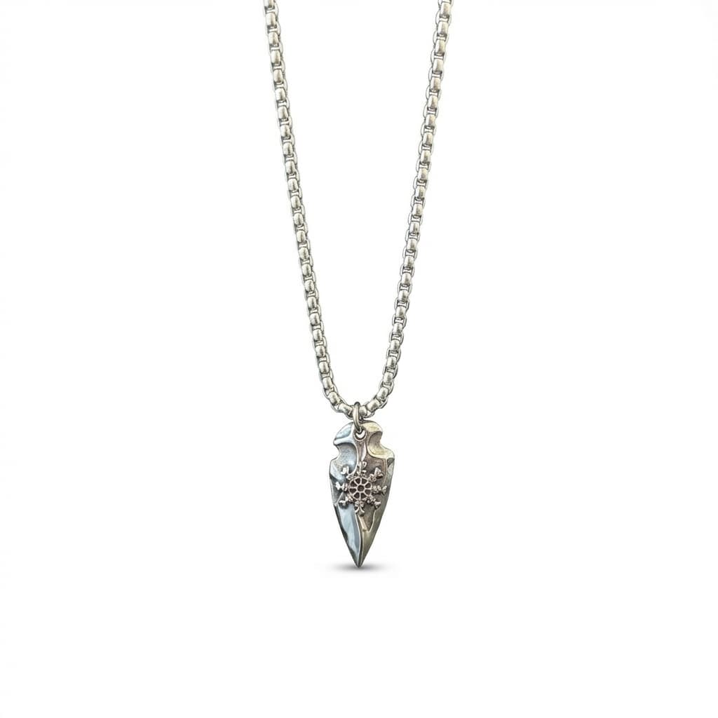 See meeste kaelakee on valmistatud vastupidavast roostevabast terasest. Ripats on nooleotsaku kujuline koos keeruka graveeringuga. See on roostekindel, niiskuskindel, higikindel ja hüpoallergeenne. Vastupidav igapäevaseks kandmiseks, ei tuhmu ega jäta nahale rohelist värvi. Mugav kanda ja sobib ka tundlikule nahale.
