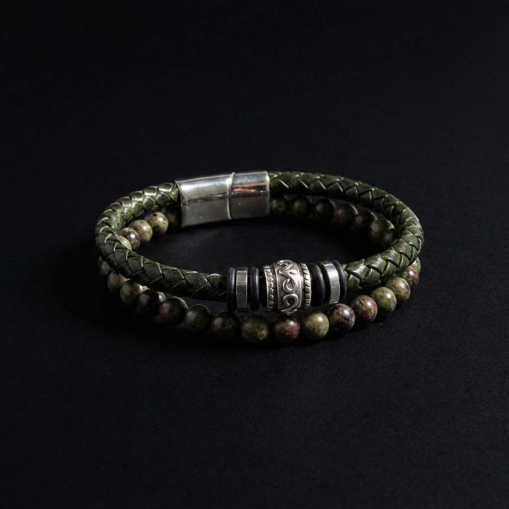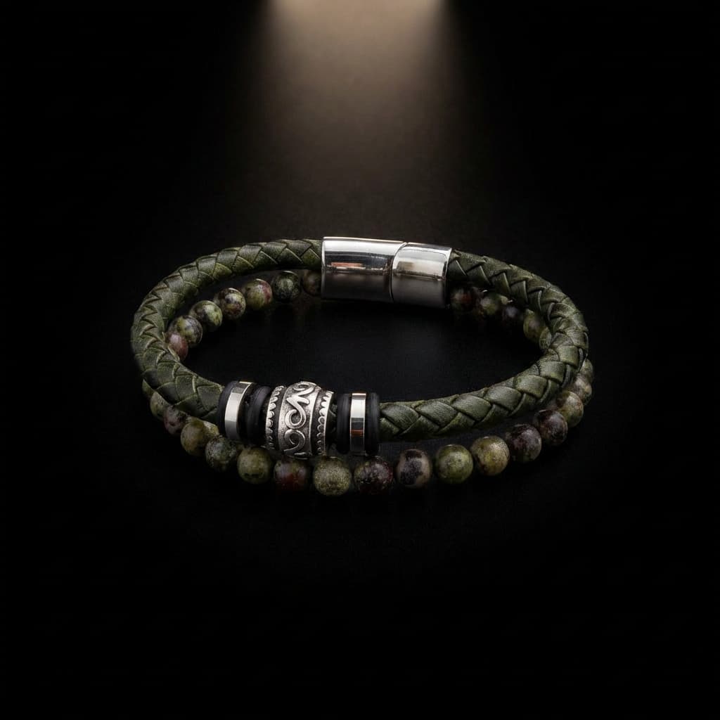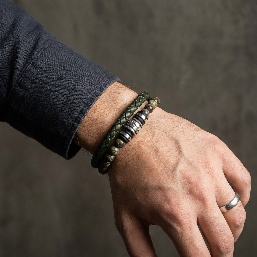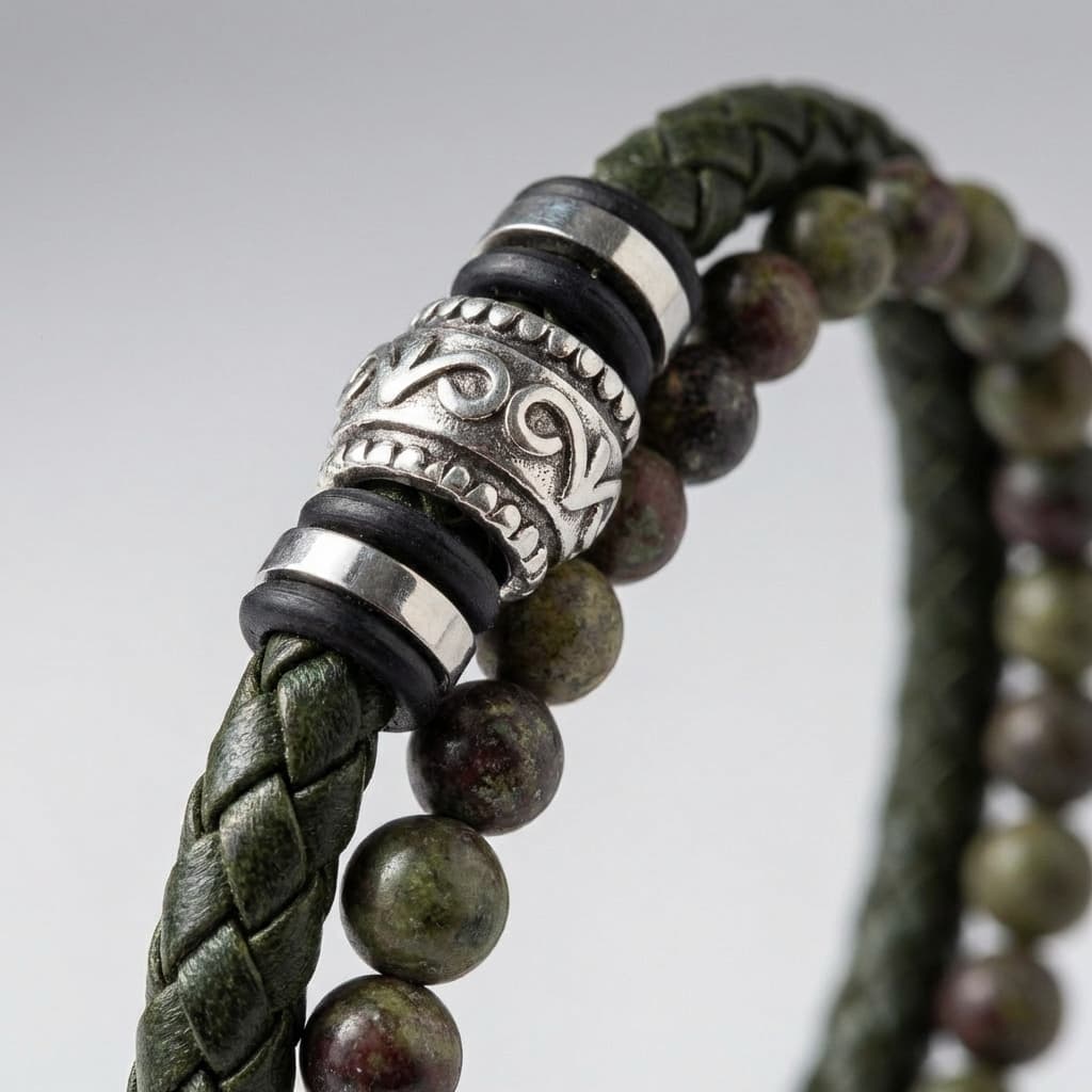 See meeste käevõru ühendab rohelise põimitud naha ja drakoni vere poolvääriskivi helmed kahekordse käevõruna. Ornamentaalse mustriga roostevabast terasest dekoratiivdetail lisab käevõrule iseloomu.