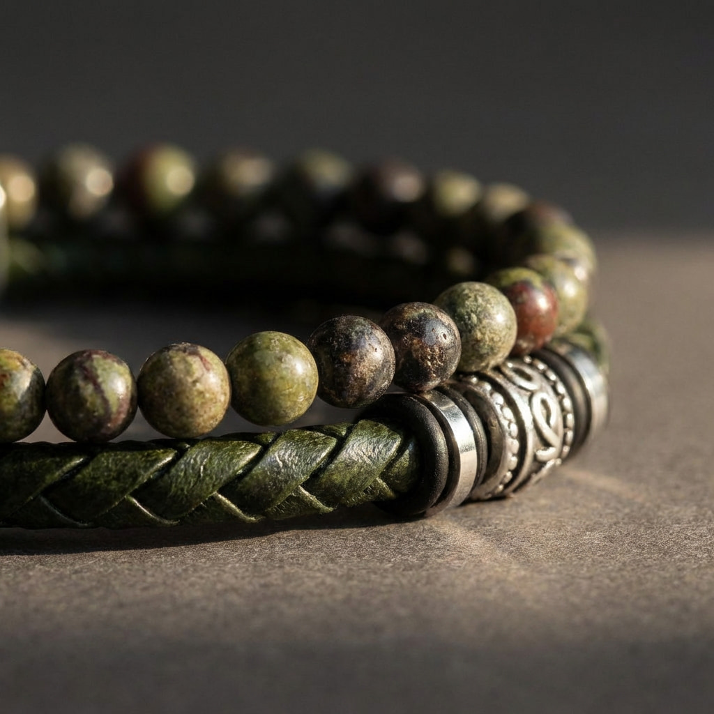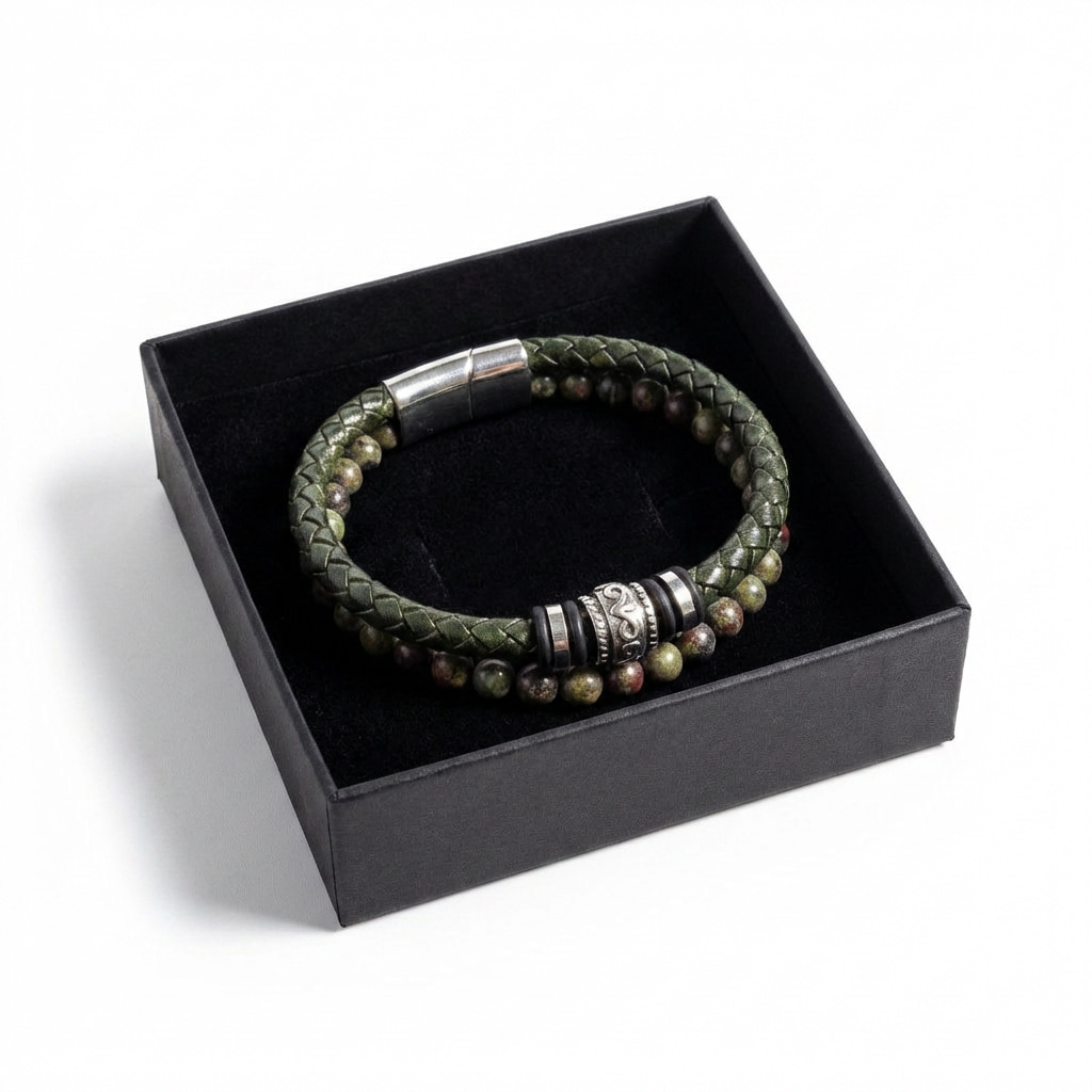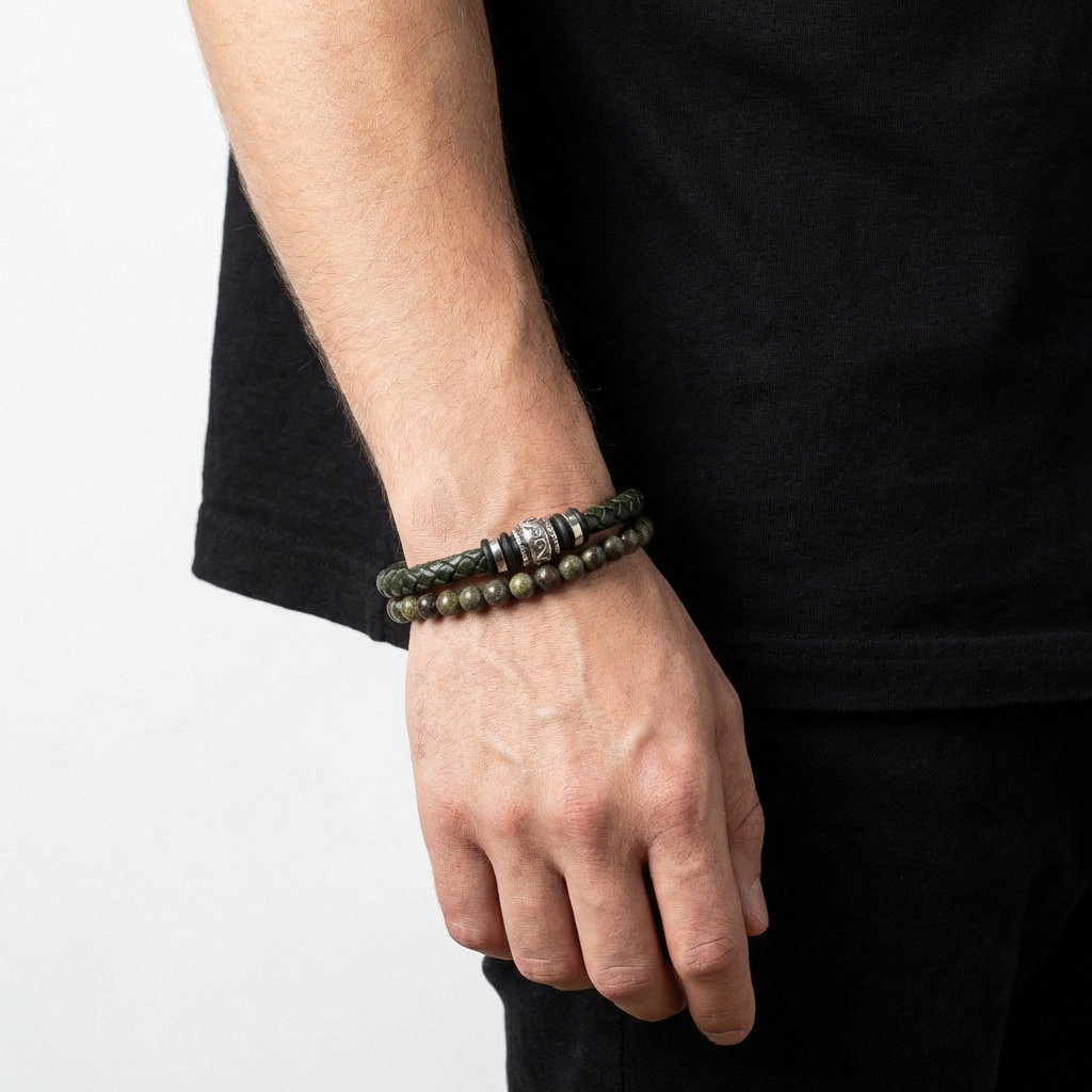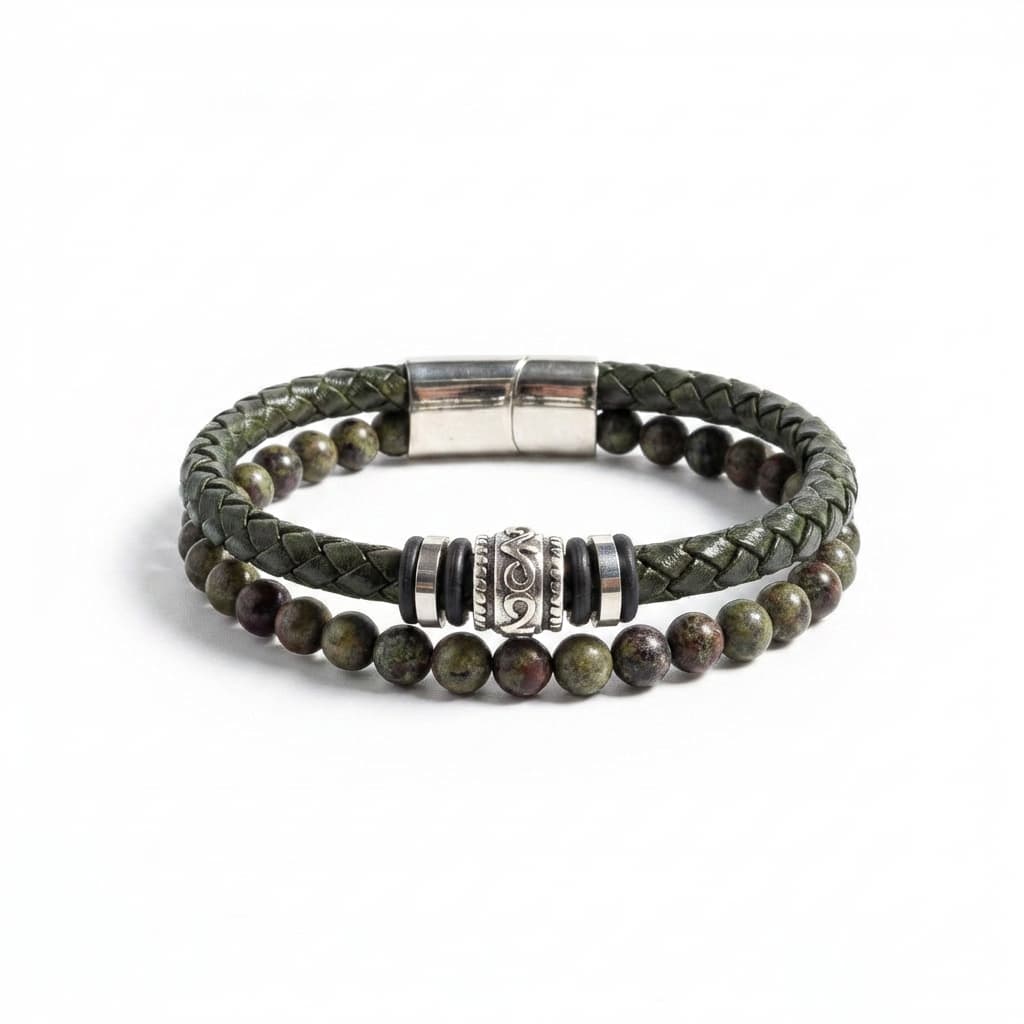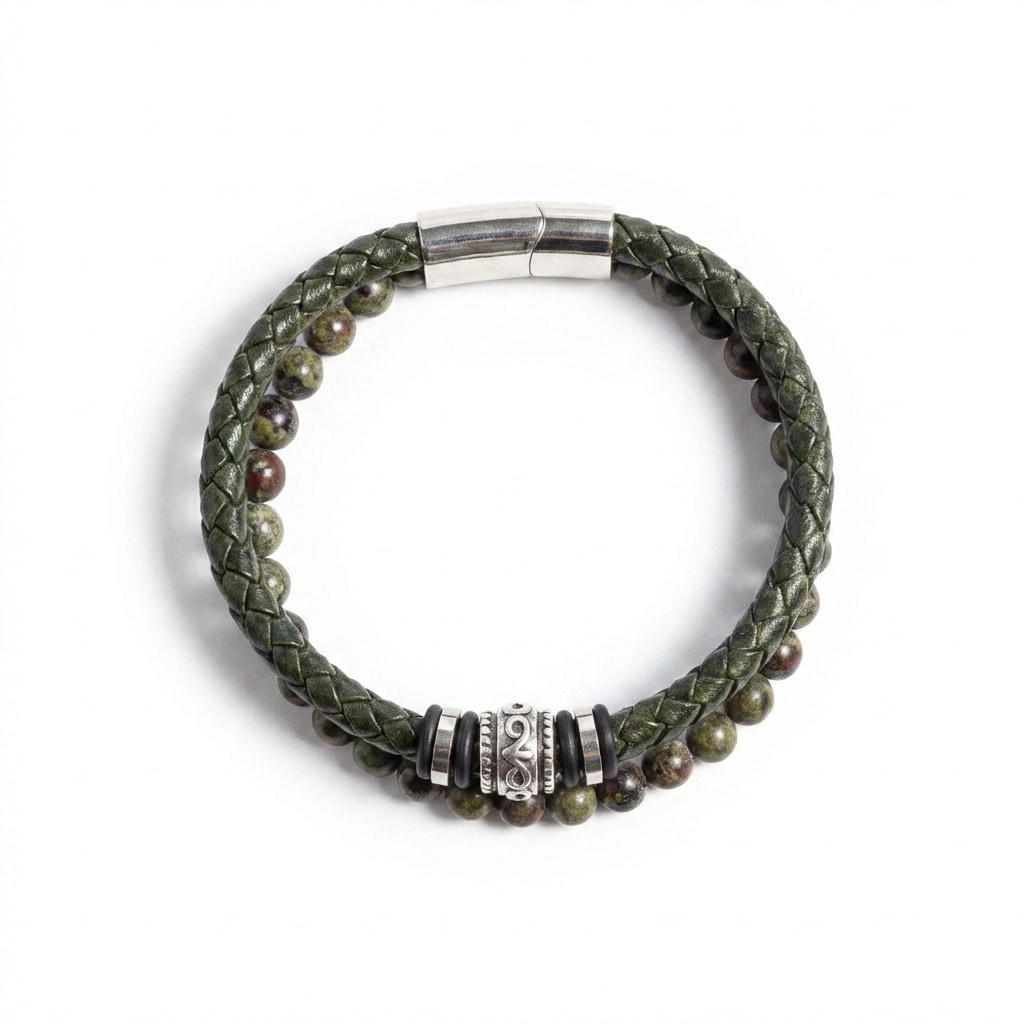 See meeste käevõru ühendab rohelise põimitud naha ja drakoni vere poolvääriskivi helmed kahekordse käevõruna. Ornamentaalse mustriga roostevabast terasest dekoratiivdetail lisab käevõrule iseloomu.