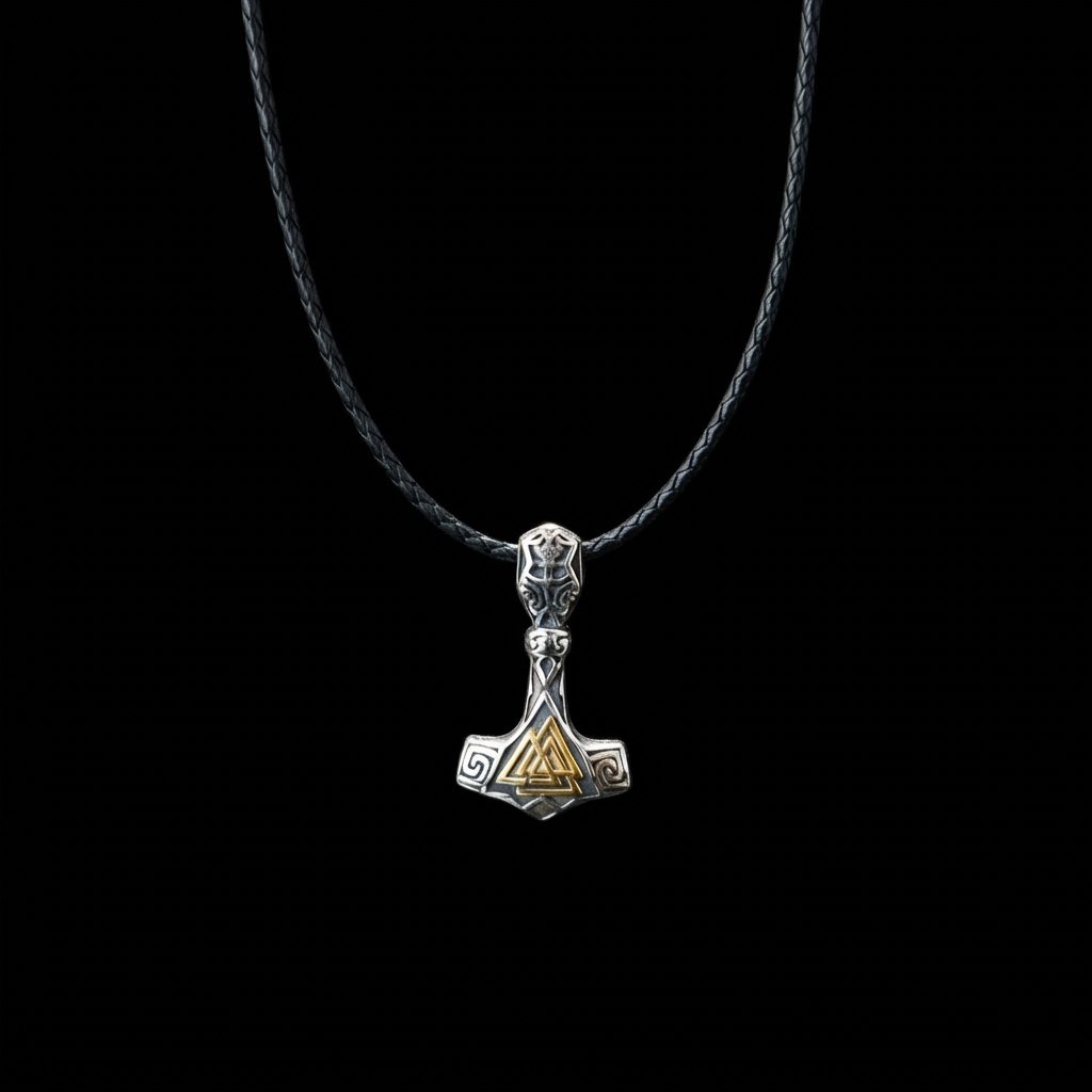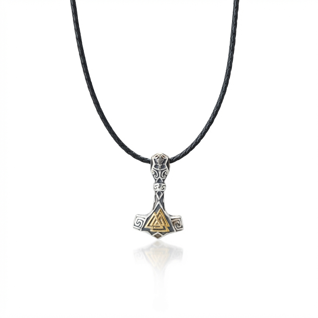 Meeste nahkpaelaga kaelakee Mjölniri ripatsiga – kuldne Valknut keskel ja spiraalid külgedel.