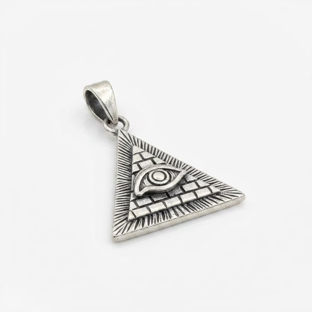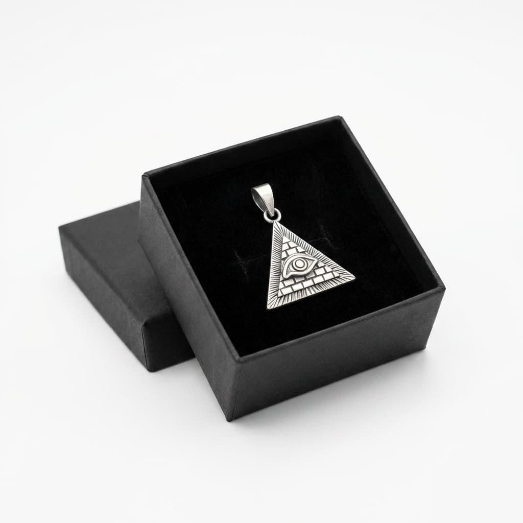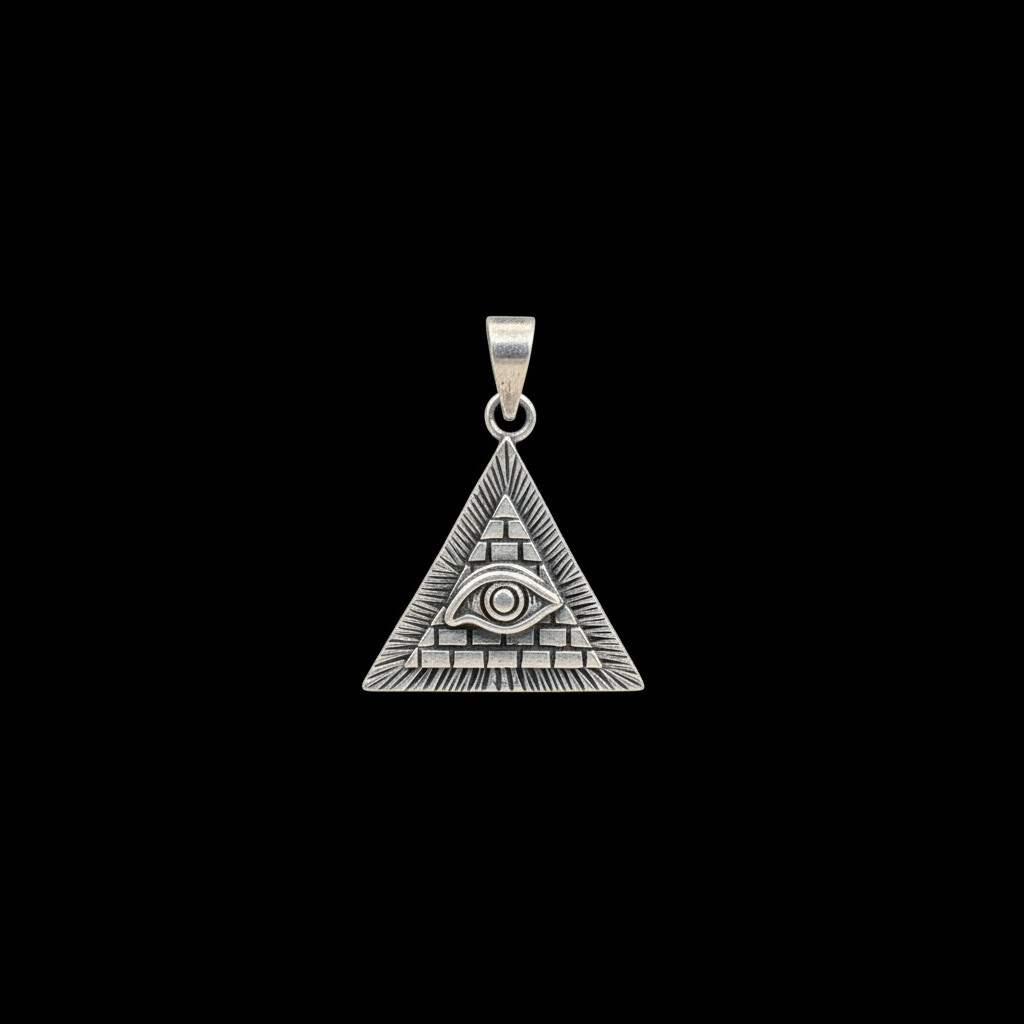Valmistatud täishõbedast 925. Kolmnurkne ripats kujutab kõikgnägevat silma püramiidil – iidset sümbolit, mida seostatakse teadlikkuse ja kaitsega. Detailne telliskivimuster ja kiirgav serv annavad ripatsile tugeva karakteri.