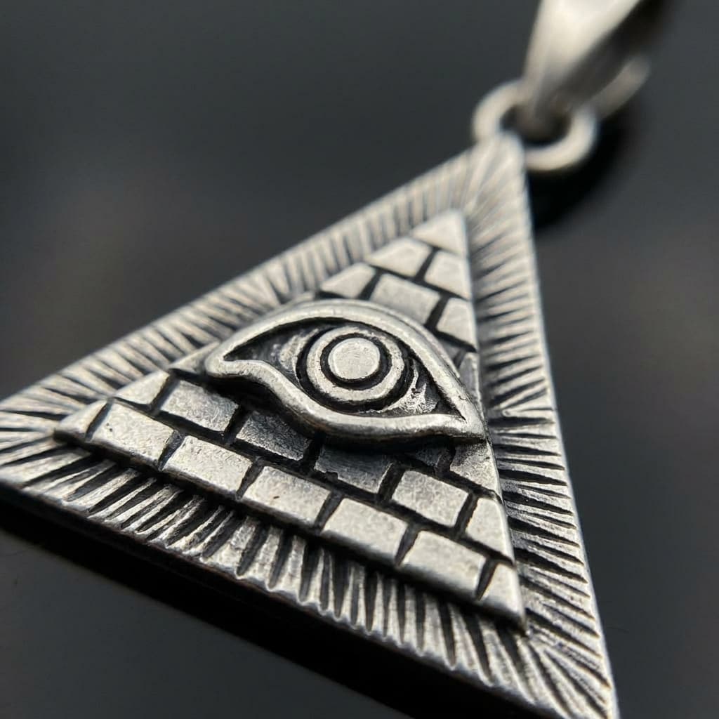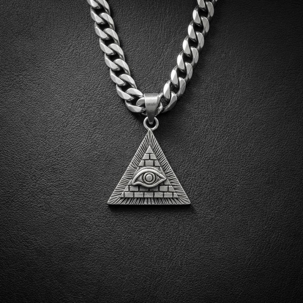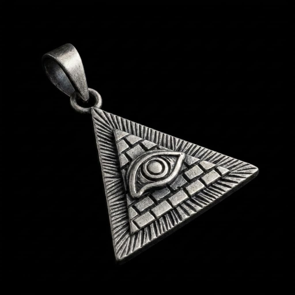 Valmistatud täishõbedast 925. Kolmnurkne ripats kujutab kõikgnägevat silma püramiidil – iidset sümbolit, mida seostatakse teadlikkuse ja kaitsega. Detailne telliskivimuster ja kiirgav serv annavad ripatsile tugeva karakteri.