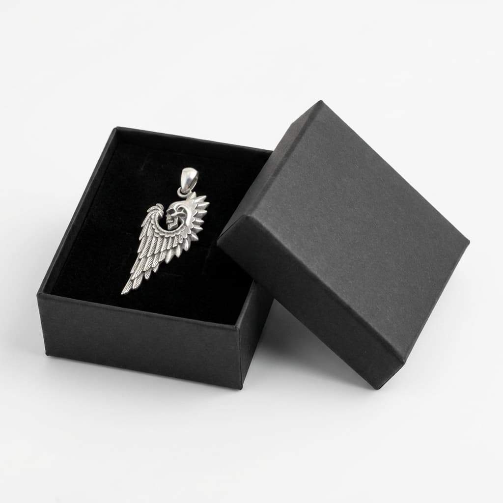 925 hõbedast kolju ja tiiva ripats – detailne sulgedega tiib koljuga.