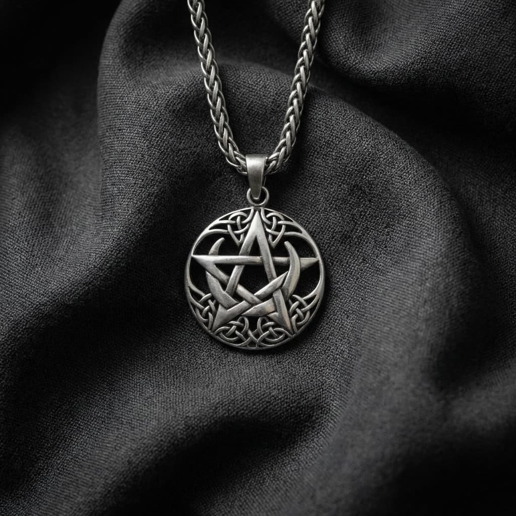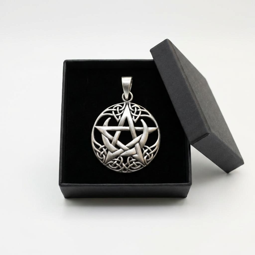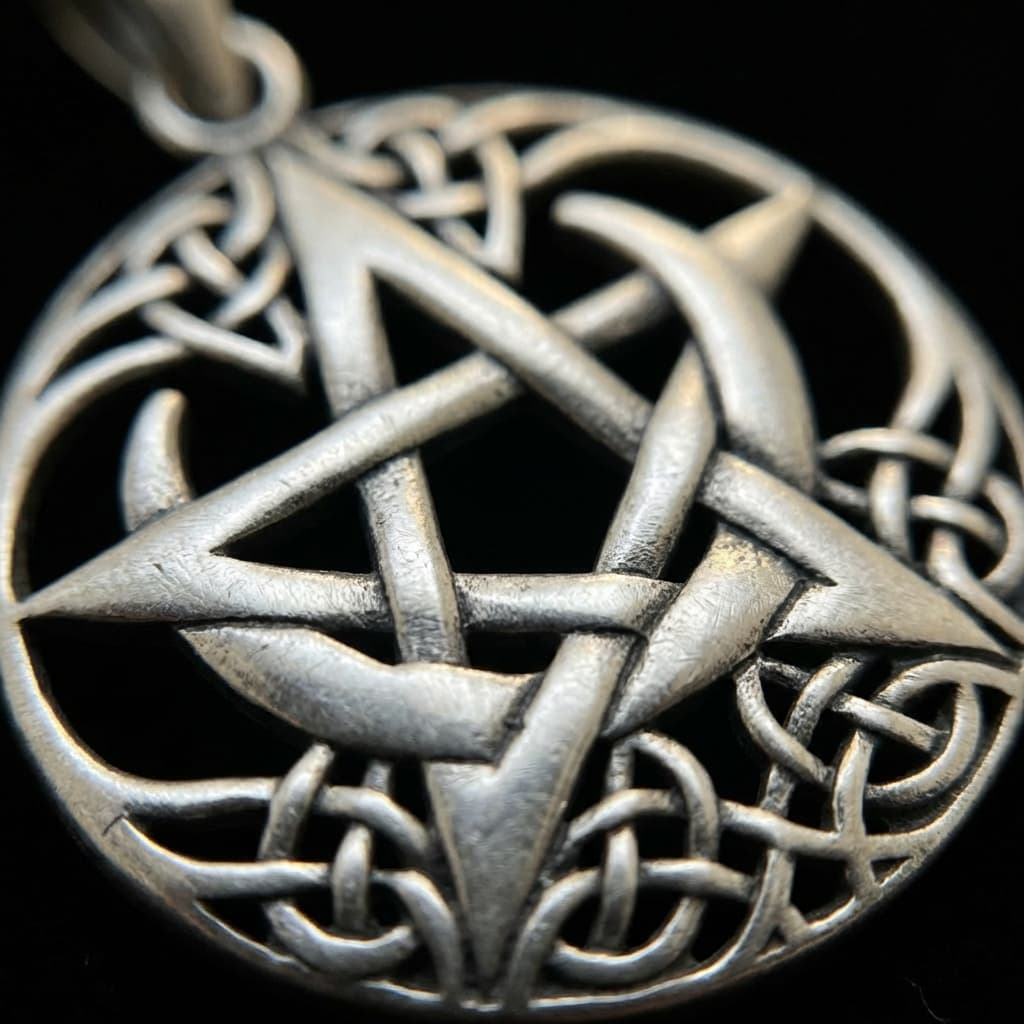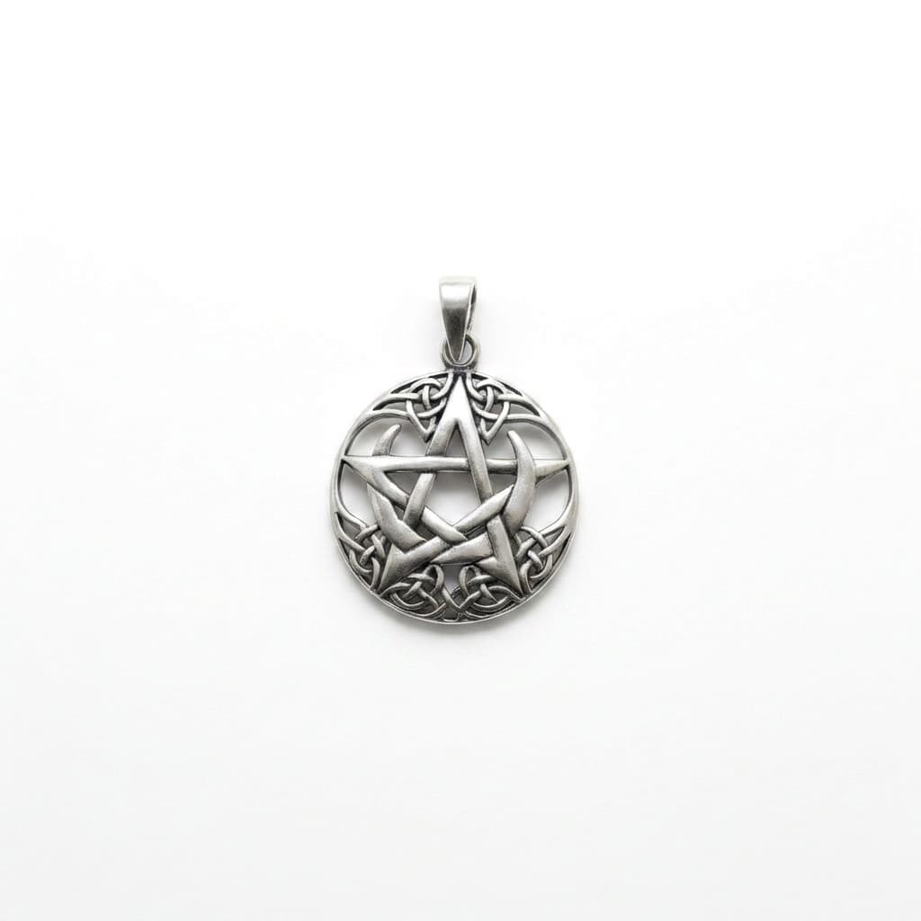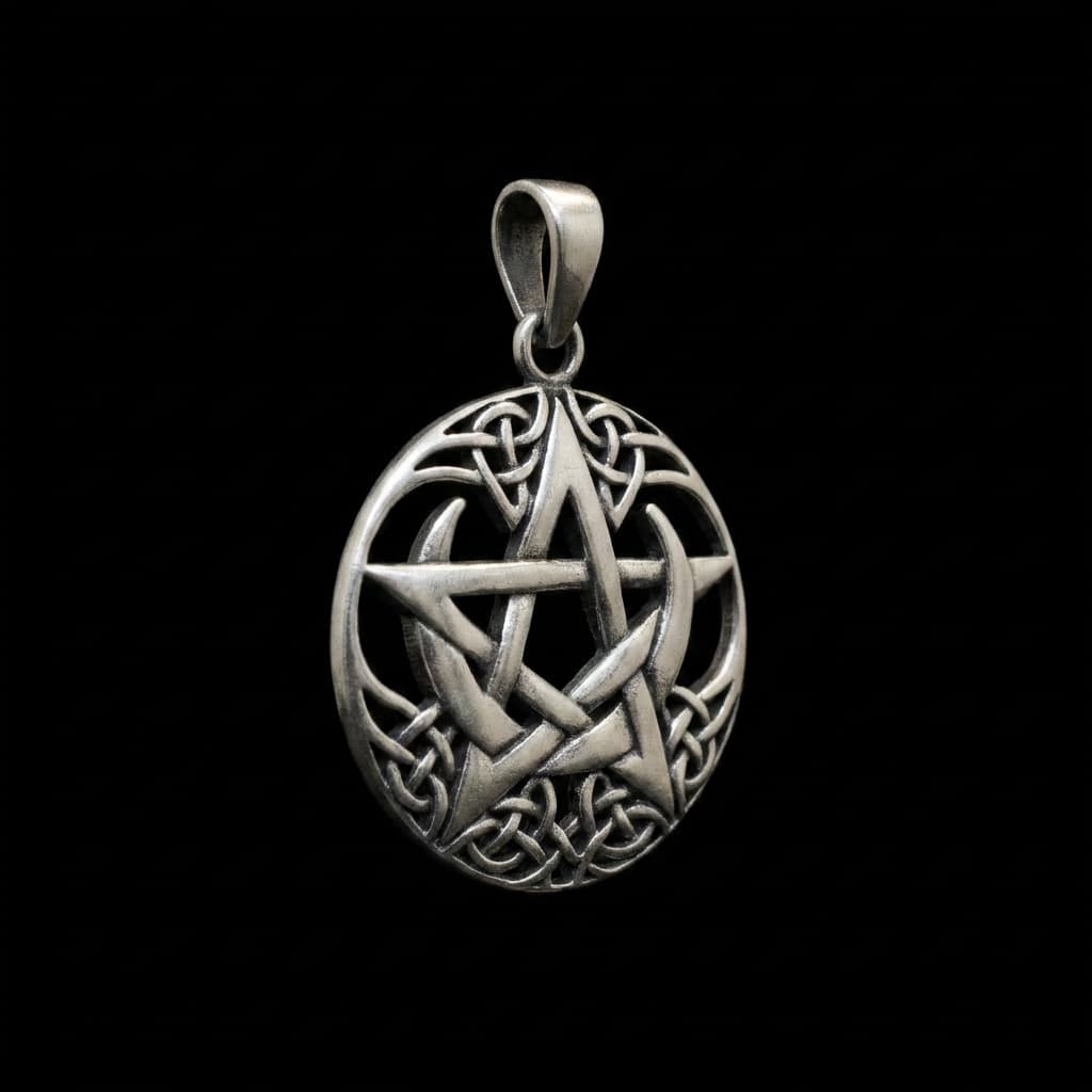 Valmistatud täishõbedast 925. Ovaalse raamiga ripats ühendab pentagrammi, poolkuud ja keltide sõlmemustrid üheks tihedaks kompositsiooniks.