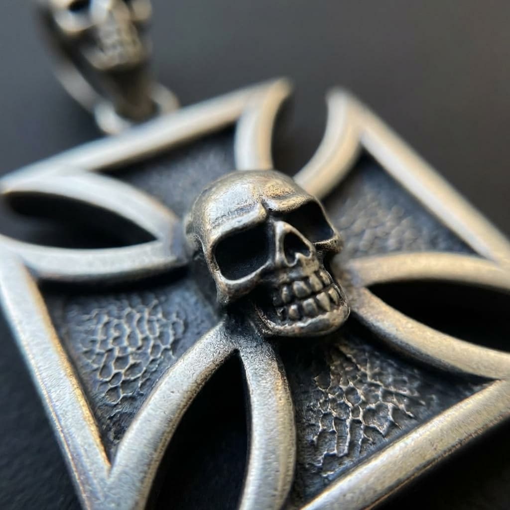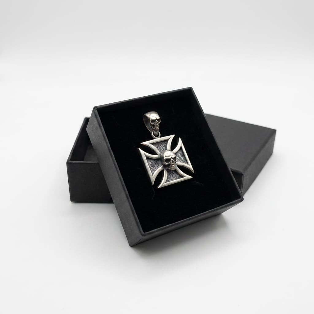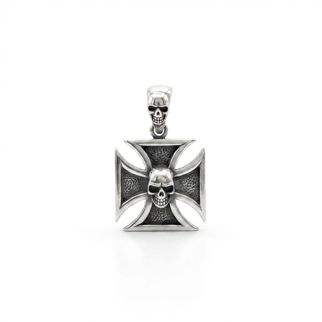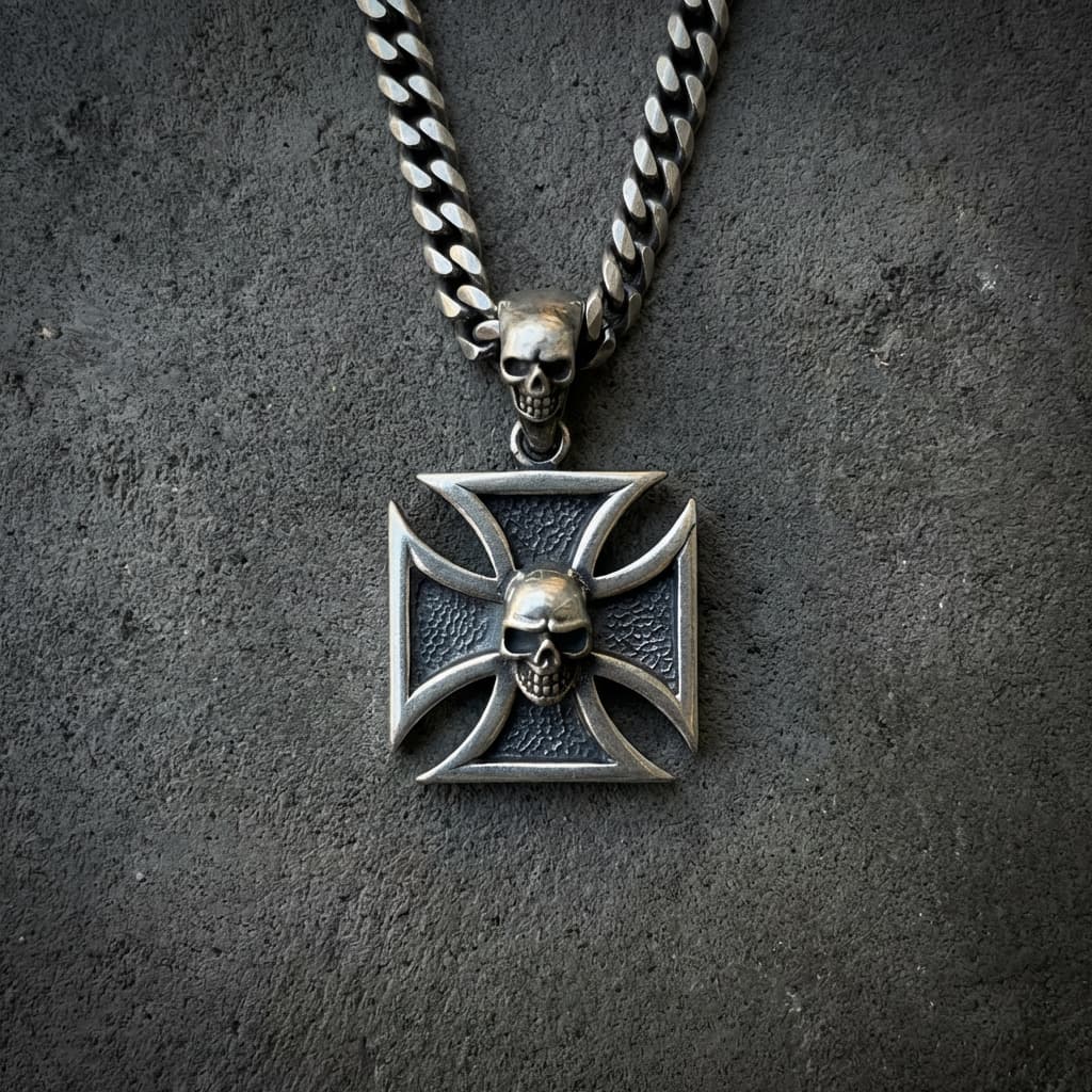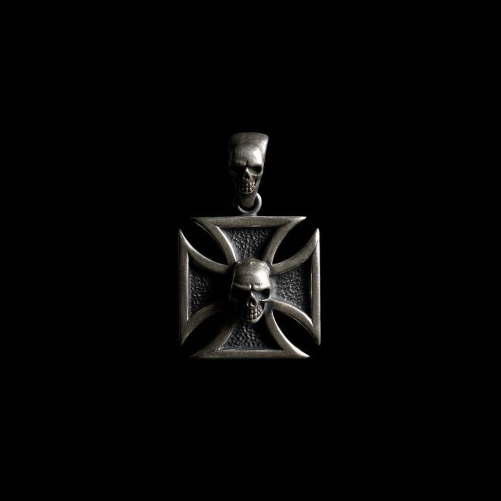 Valmistatud täishõbedast 925. Raudristi kujuline ripats tekstureeritud taustaga kannab keskel reljeefset koljut – sama motiiv kordub riputusaasas.