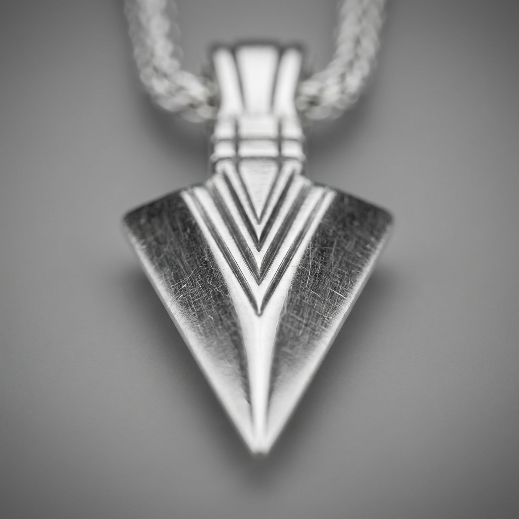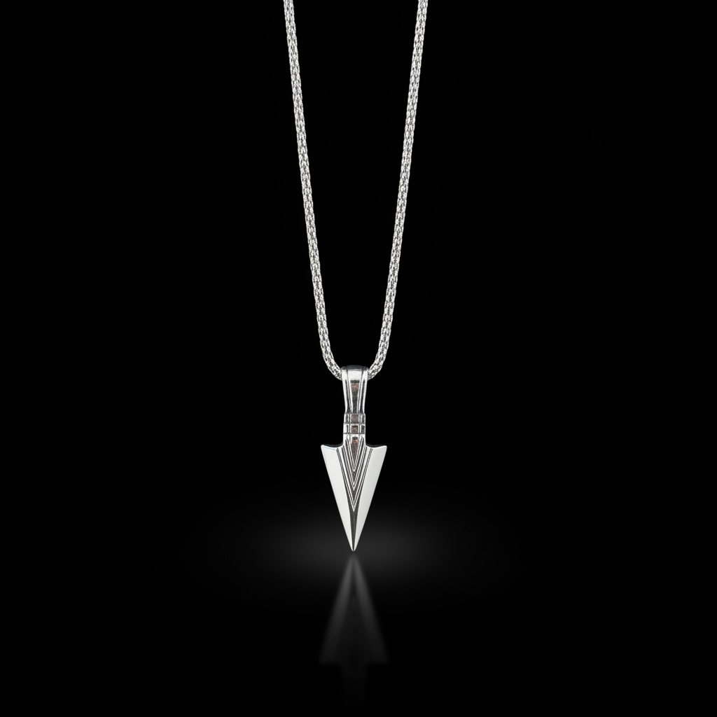 Meeste roostevabast terasest kaelakee nooleotsaku ripatsiga – minimalistlik ja teravate joontega disain.