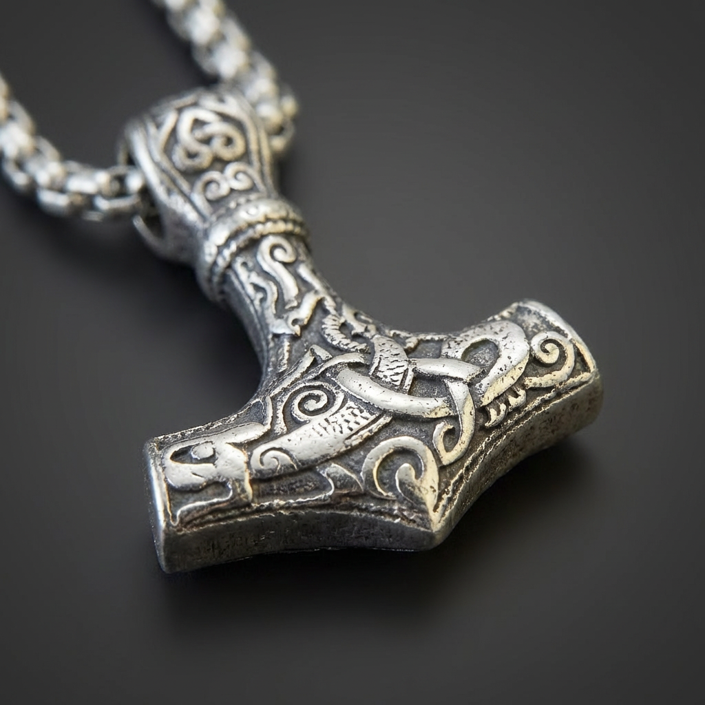 Väike Mjölniri ripats on kaetud tihedate vikingimustritega. See on roostekindel, niiskuskindel, higikindel ja hüpoallergeenne. Vastupidav igapäevaseks kandmiseks, ei tuhmu ega jäta nahale rohelist värvi. Mugav kanda ja sobib ka tundlikule nahale.