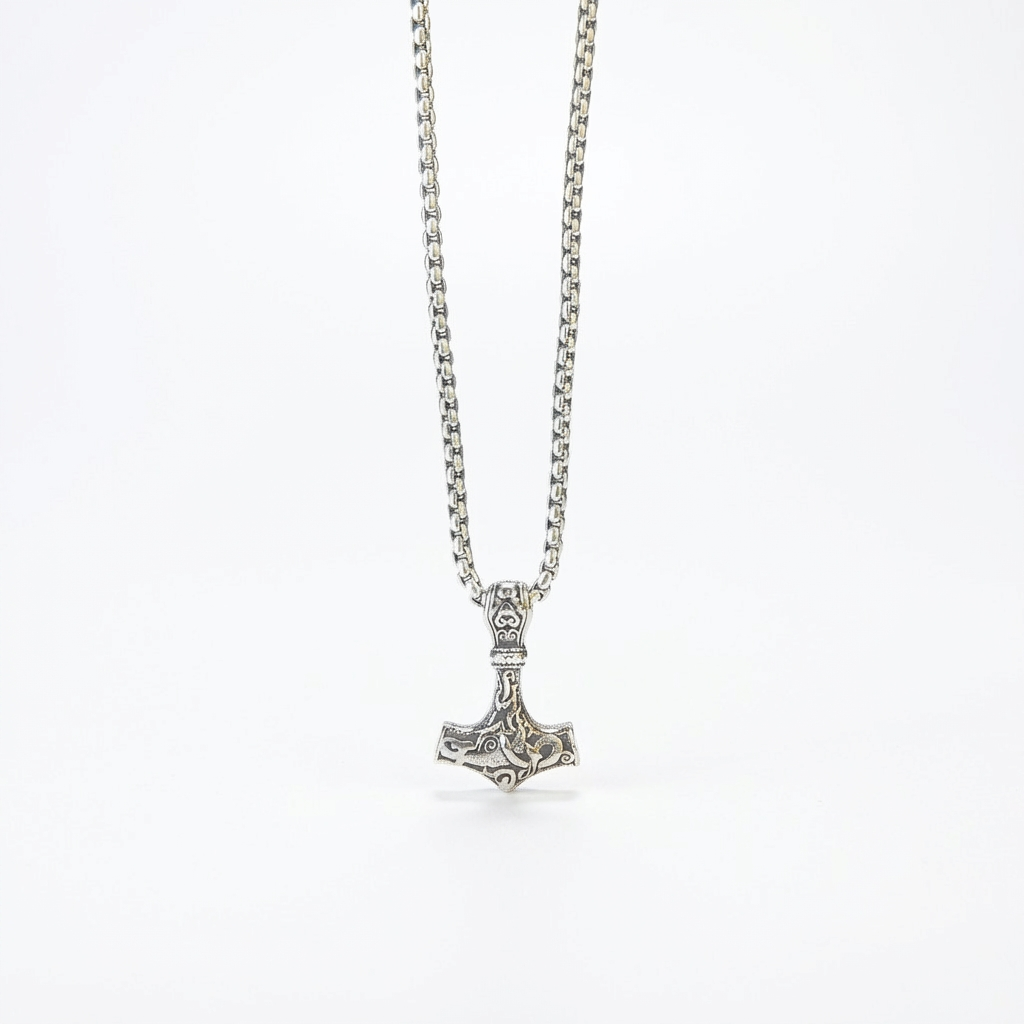 Meeste roostevabast terasest kaelakee väikese Mjölniri ripatsiga – tihedate vikingimustritega kaetud haamer.