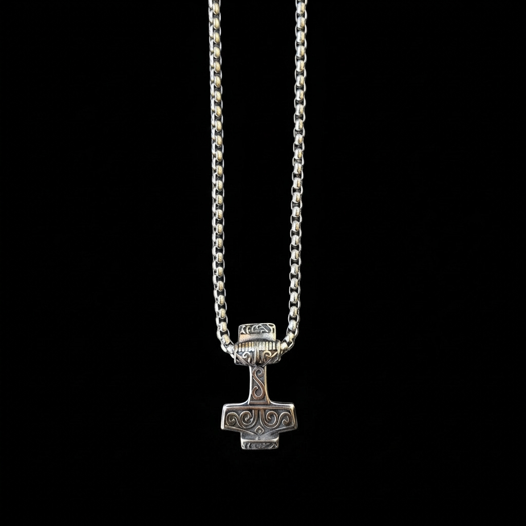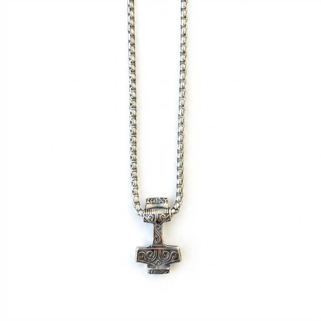 Meeste roostevabast terasest kaelakee Mjölniri ripatsiga – spiraalimustritega haamer.