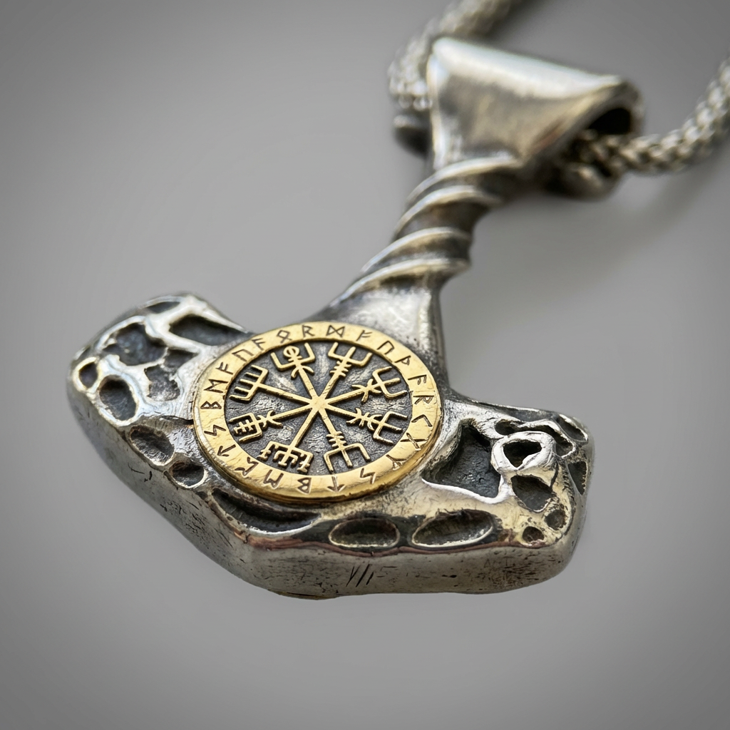 Mjölniri ripats kannab keskel kuldse viimistlusega Vegvisiri kompassi, varrel on põimitud muster. See on roostekindel, niiskuskindel, higikindel ja hüpoallergeenne. Vastupidav igapäevaseks kandmiseks, ei tuhmu ega jäta nahale rohelist värvi. Mugav kanda ja sobib ka tundlikule nahale.