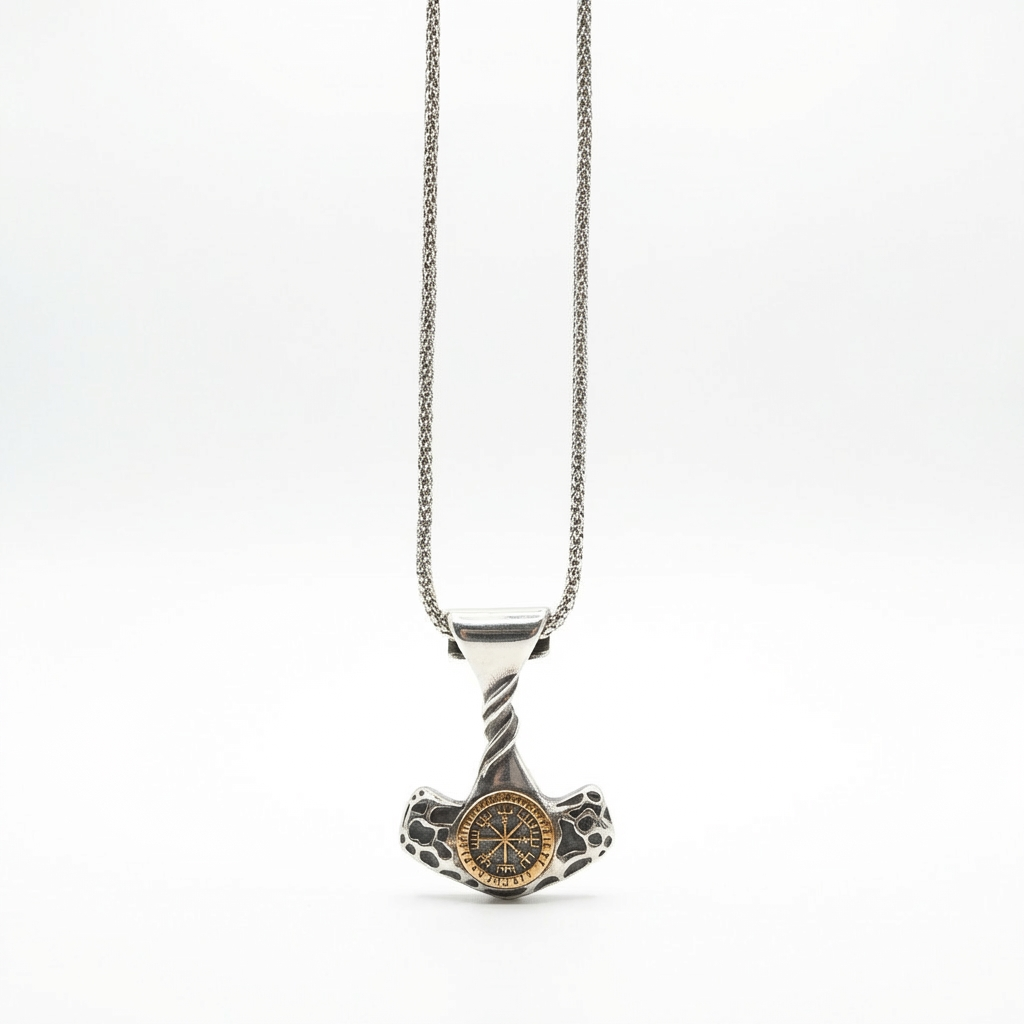 Meeste roostevabast terasest kaelakee Mjölniri ripatsiga – kuldne Vegvisir keskel ja põimitud varrega.