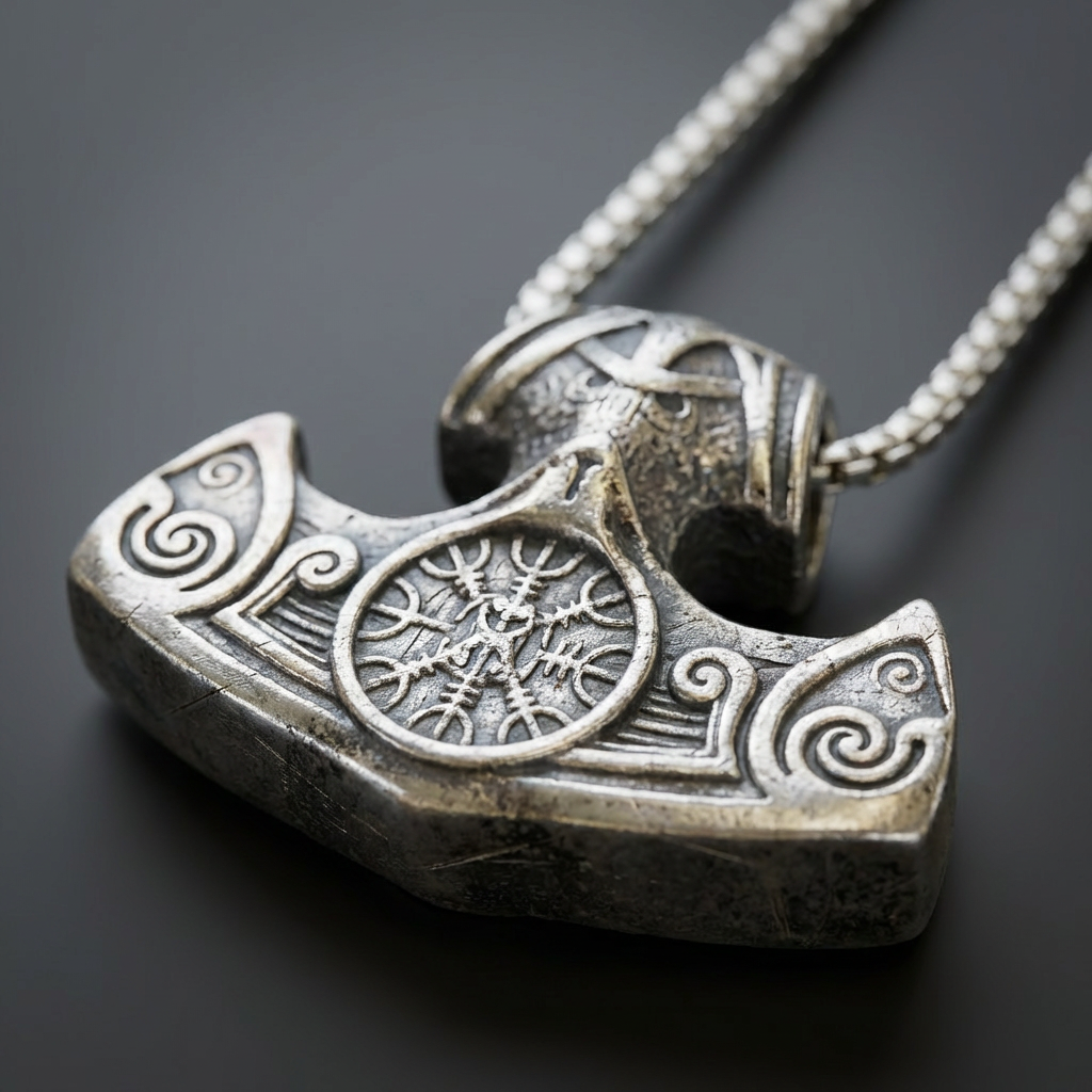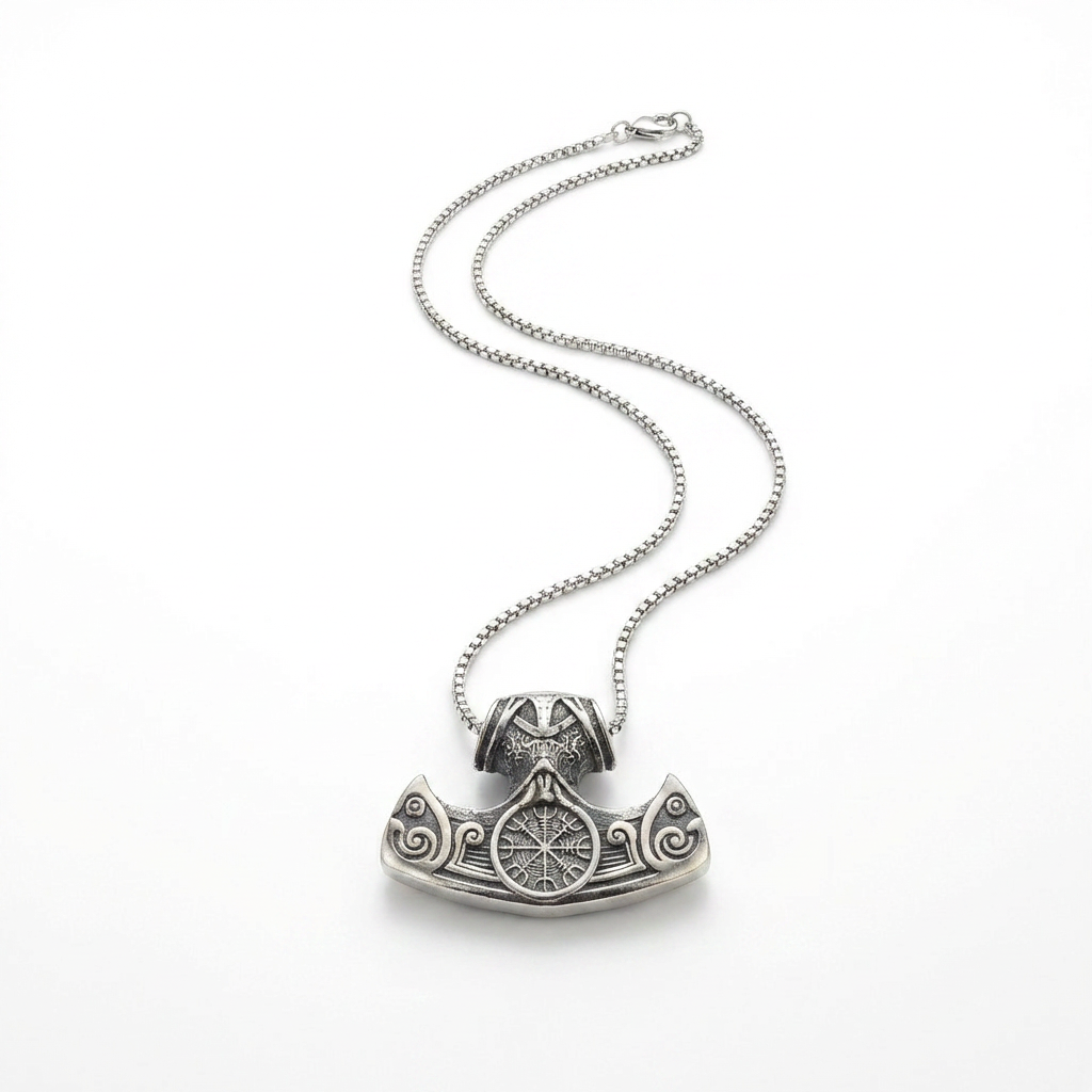 Meeste roostevabast terasest kaelakee Mjölniri ripatsiga – Vegvisiri kompass keskel ja spiraalid külgedel.